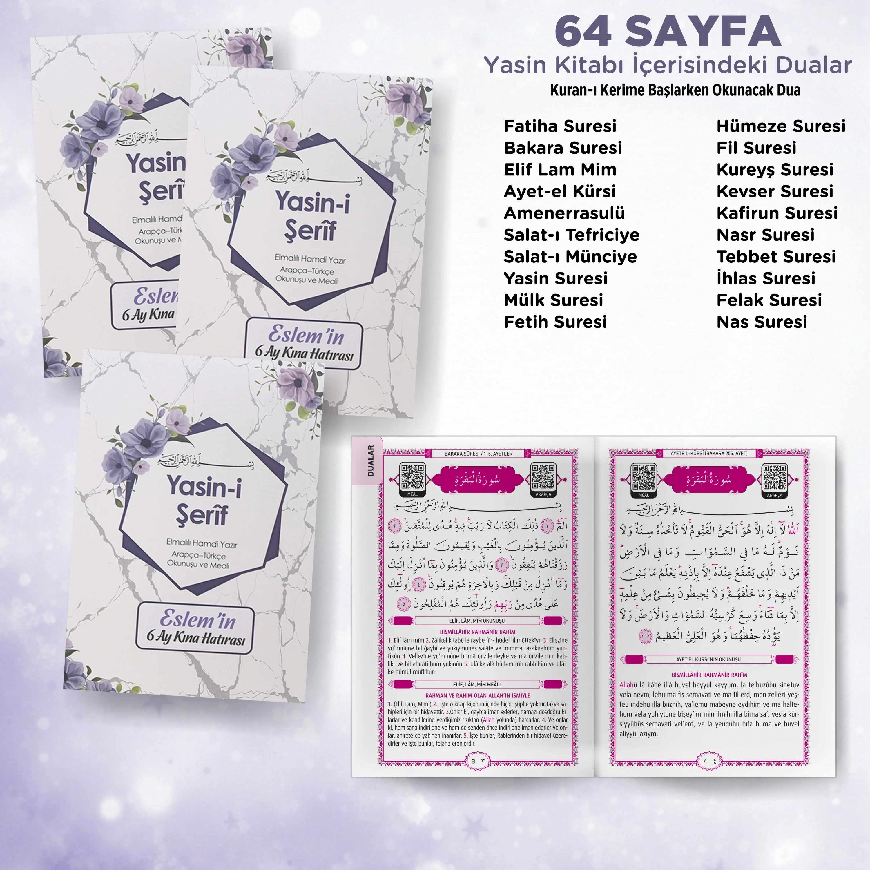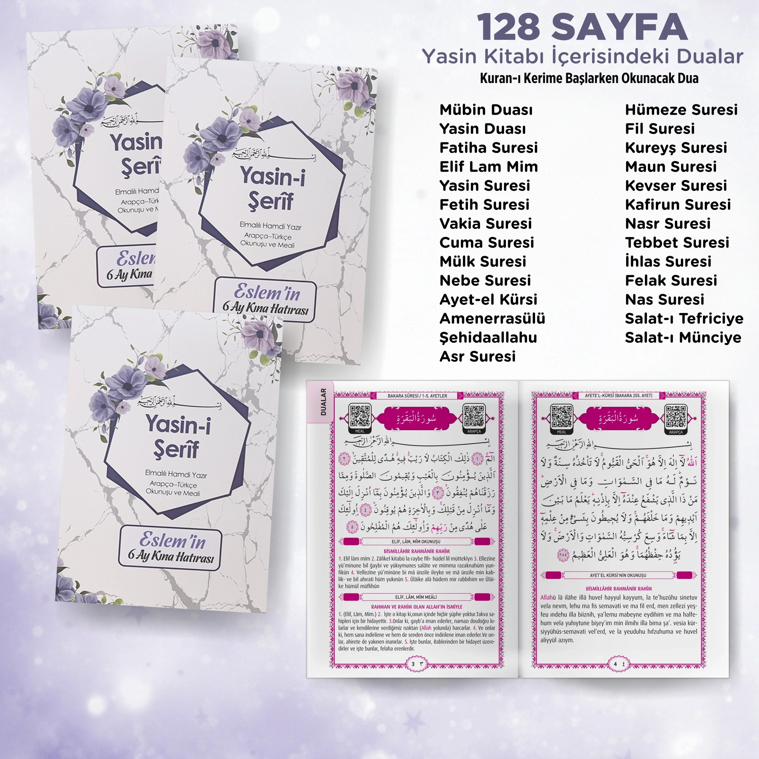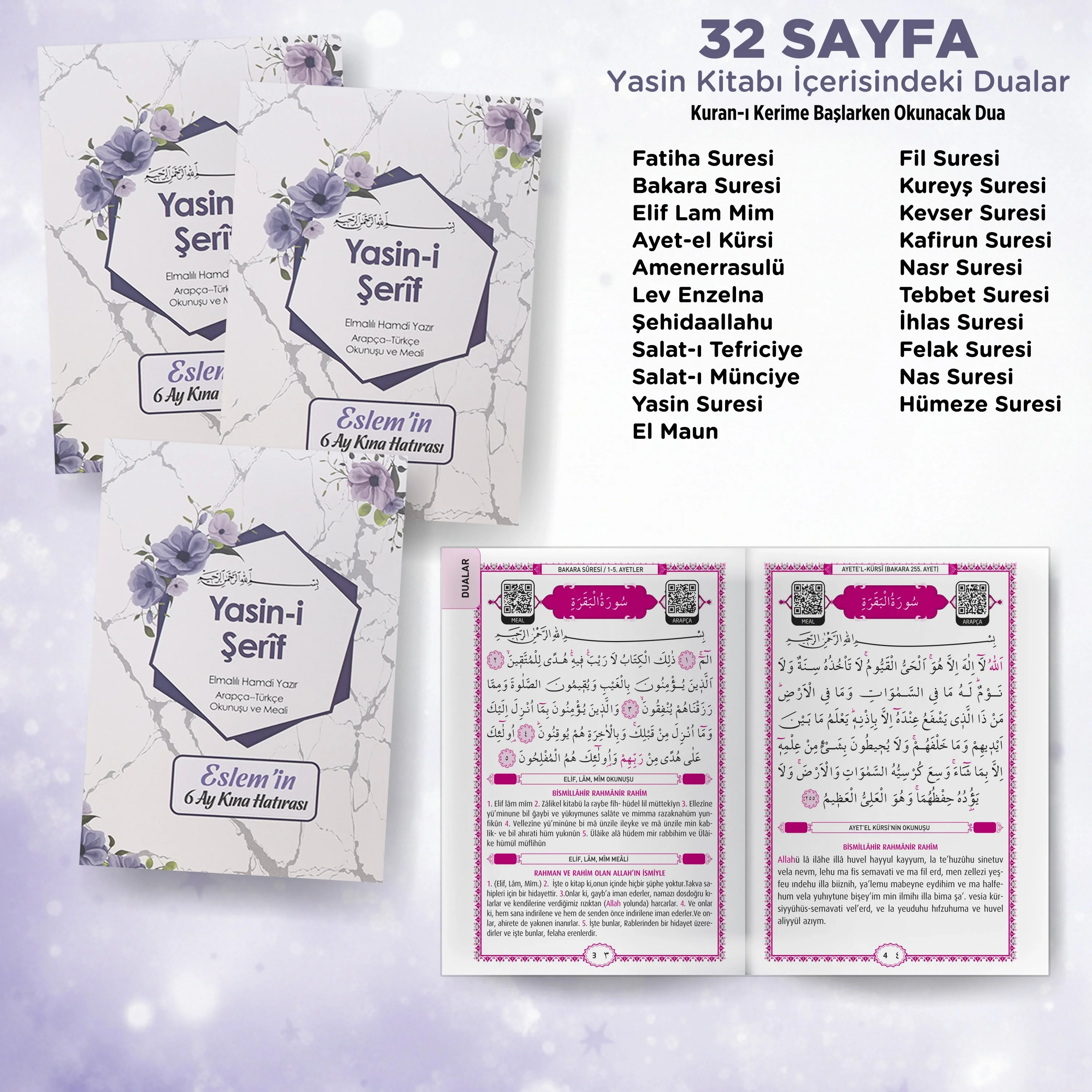 Altıgen deseni ve mor renk, sete sadece estetik bir güzellik değil, aynı zamanda duygu yüklü bir anlam katar. Özellikle Kız Bebek Mevlütleri, nişan mevlütleri, hac ve umre mevlütleri gibi özel günlerde tercih edilen bu set, içeriğinde barındırdığı özel dua ile duygusal bir bağ kurmanıza olanak tanır.
