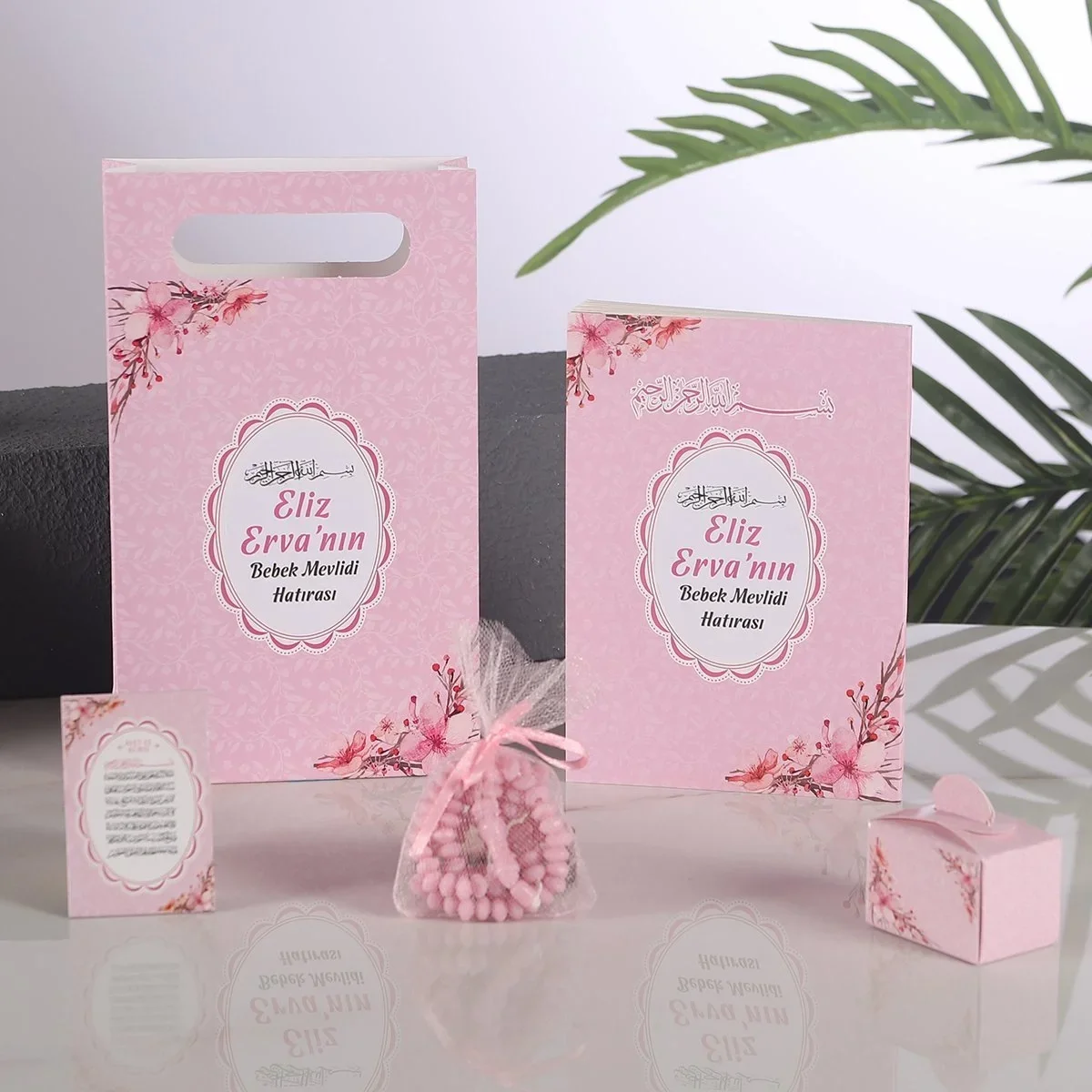 Çiçek Model Pembe Renkli Yasin Kitabı, Lokum Kutusu, Magnet, Karton Çanta ve Tesbih - Mevlüt Hediyelikleri