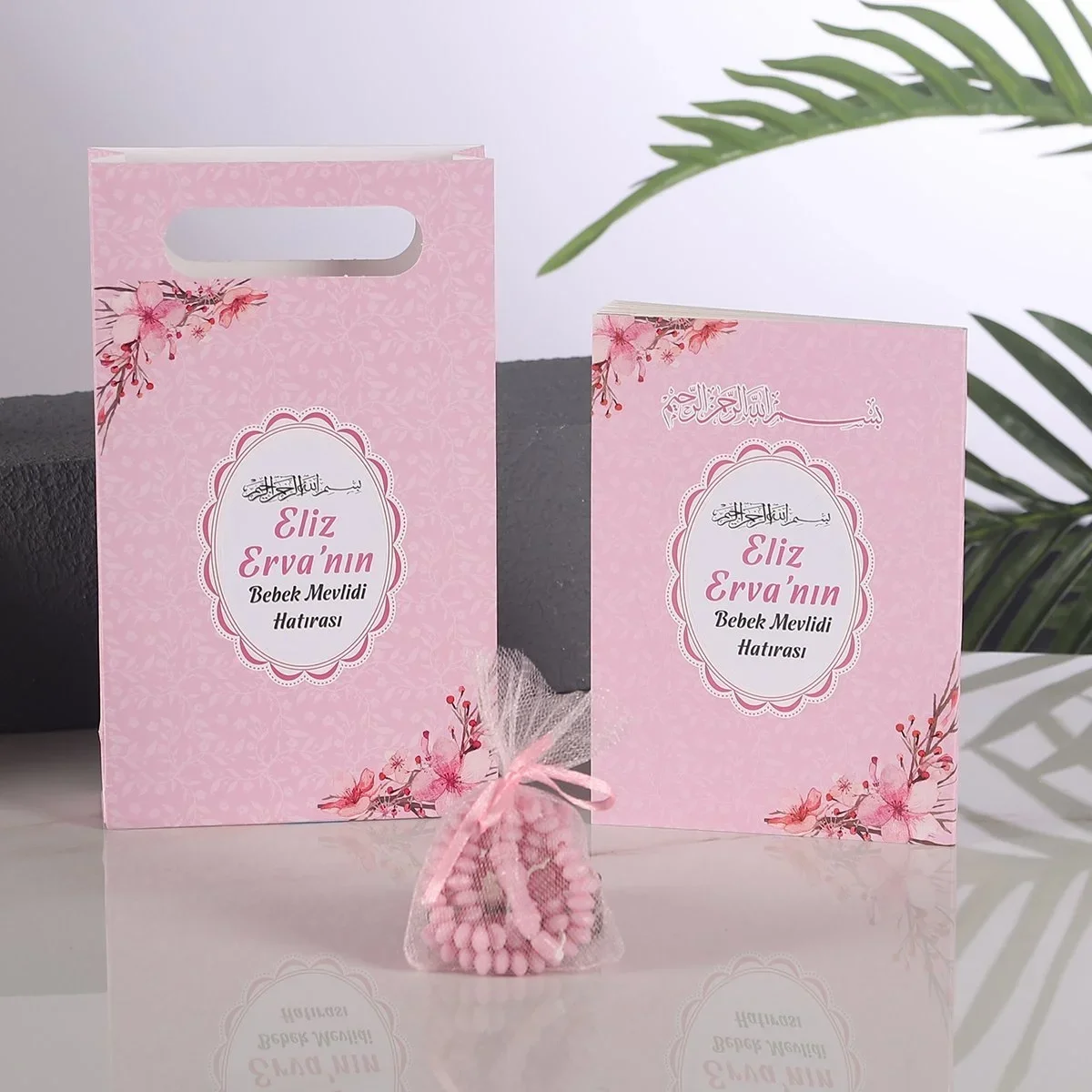Çiçek Model Pembe Renkli Yasin Kitabı, Karton Çanta ve Tesbih - Mevlüt Hediyelikleri