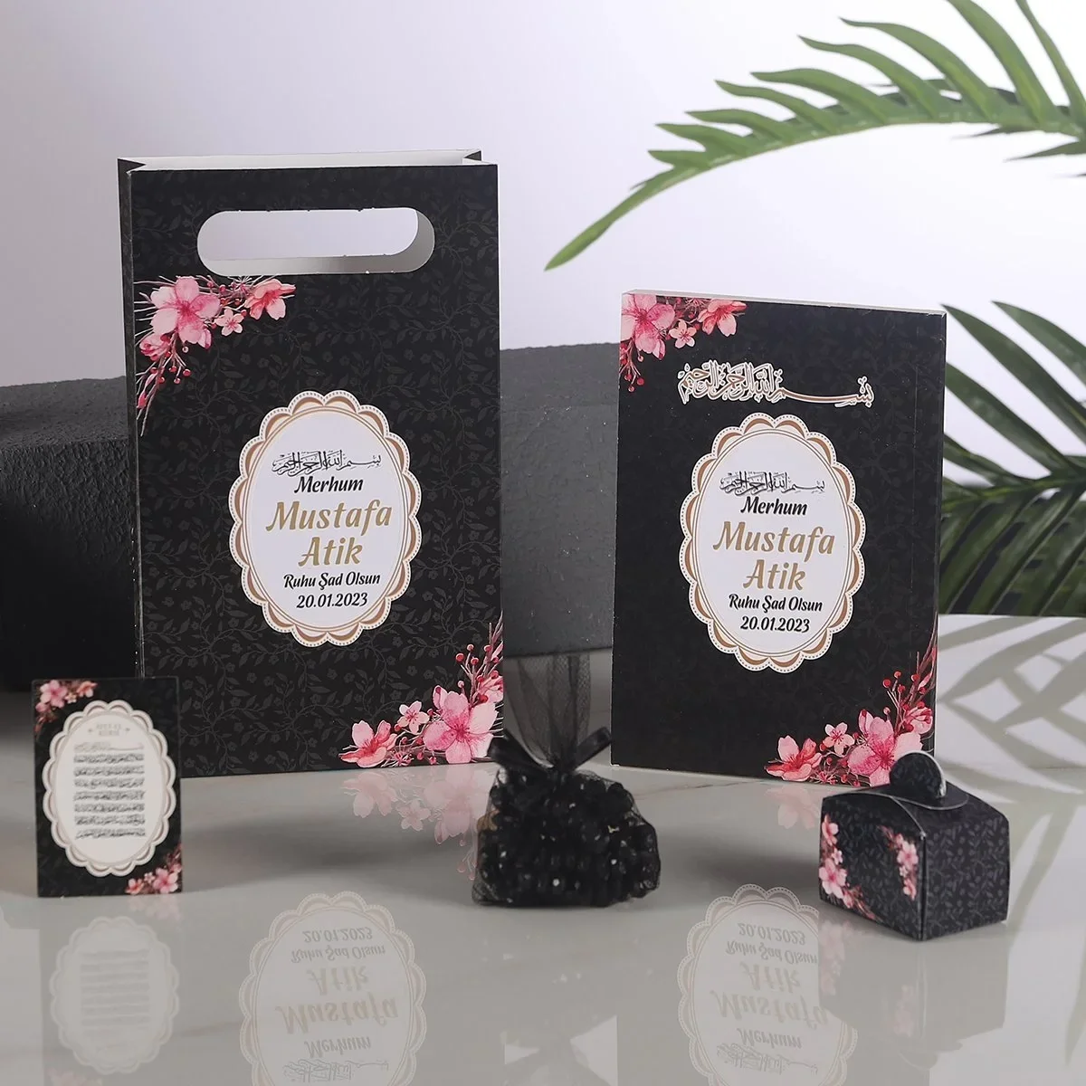 Çiçek Model Siyah Renkli Yasin Kitabı, Lokum Kutusu, Magnet, Karton Çanta ve Tesbih - Mevlüt Hediyelikleri