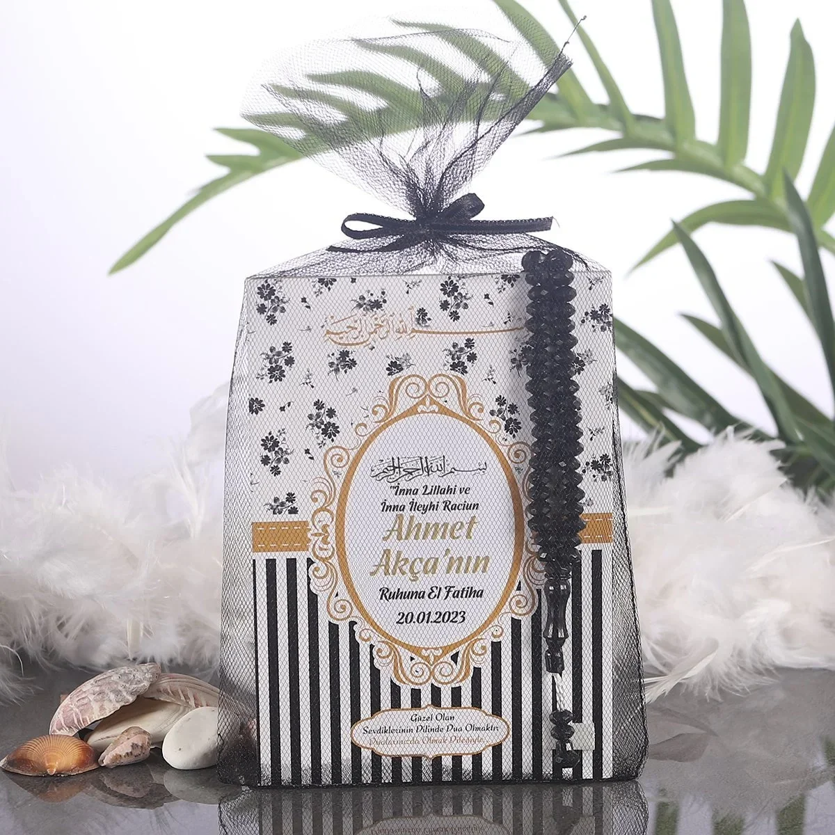 Çizgi Model Siyah Renkli Tül Kese İçerisinde Yasin Kitabı ve Tesbih - Mevlüt Hediyelikleri