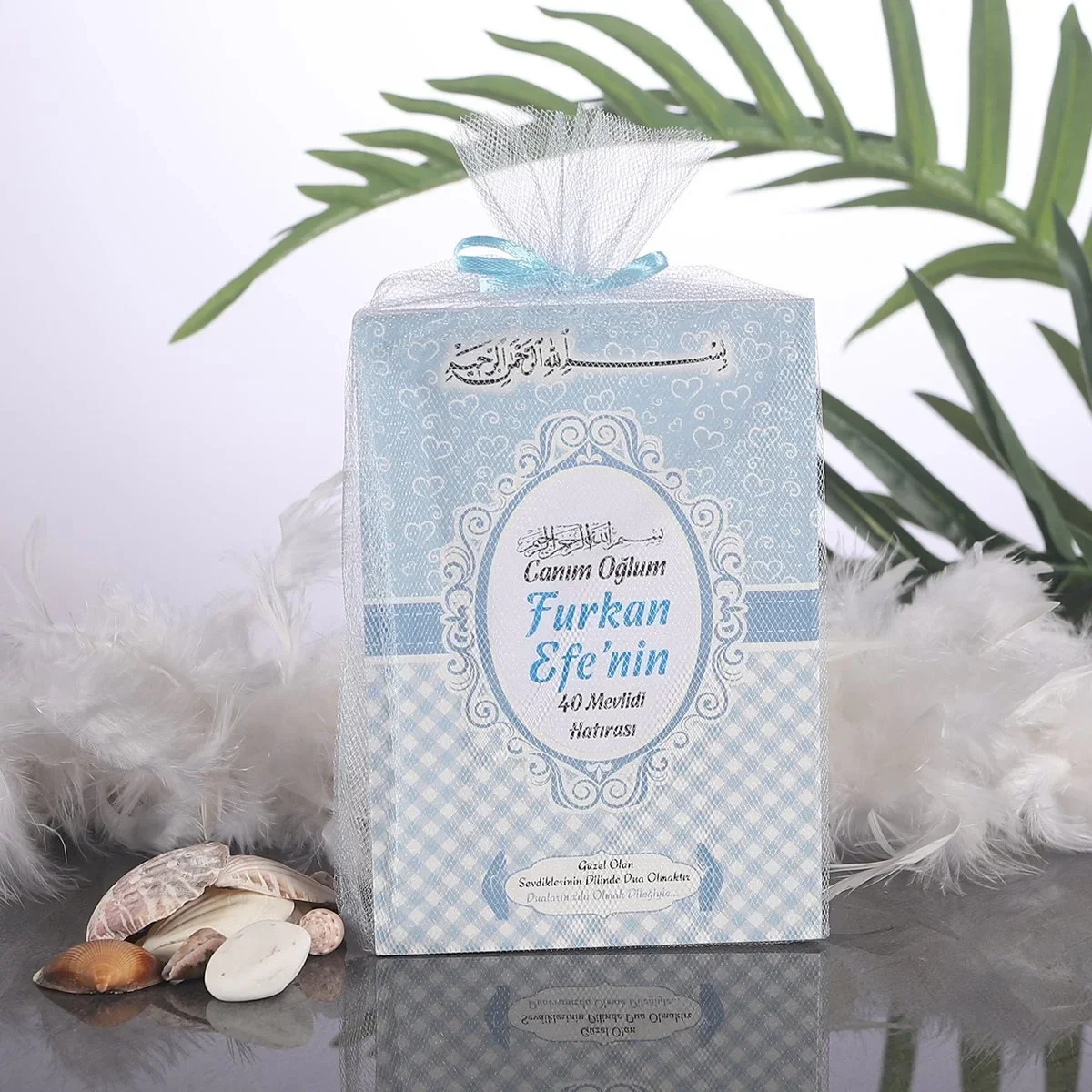 Erkek Bebek Mevlütleri için ideal olan bu set, yeni doğan bebekleri olan aileler tarafından sıkça tercih edilir. Kalp Model Mavi Renkli Tül Kese içindeki Yasin Kitabı, içeriğindeki anlam dolu dualar ile sevdiklerinizin dua anlarını daha özel kılar.