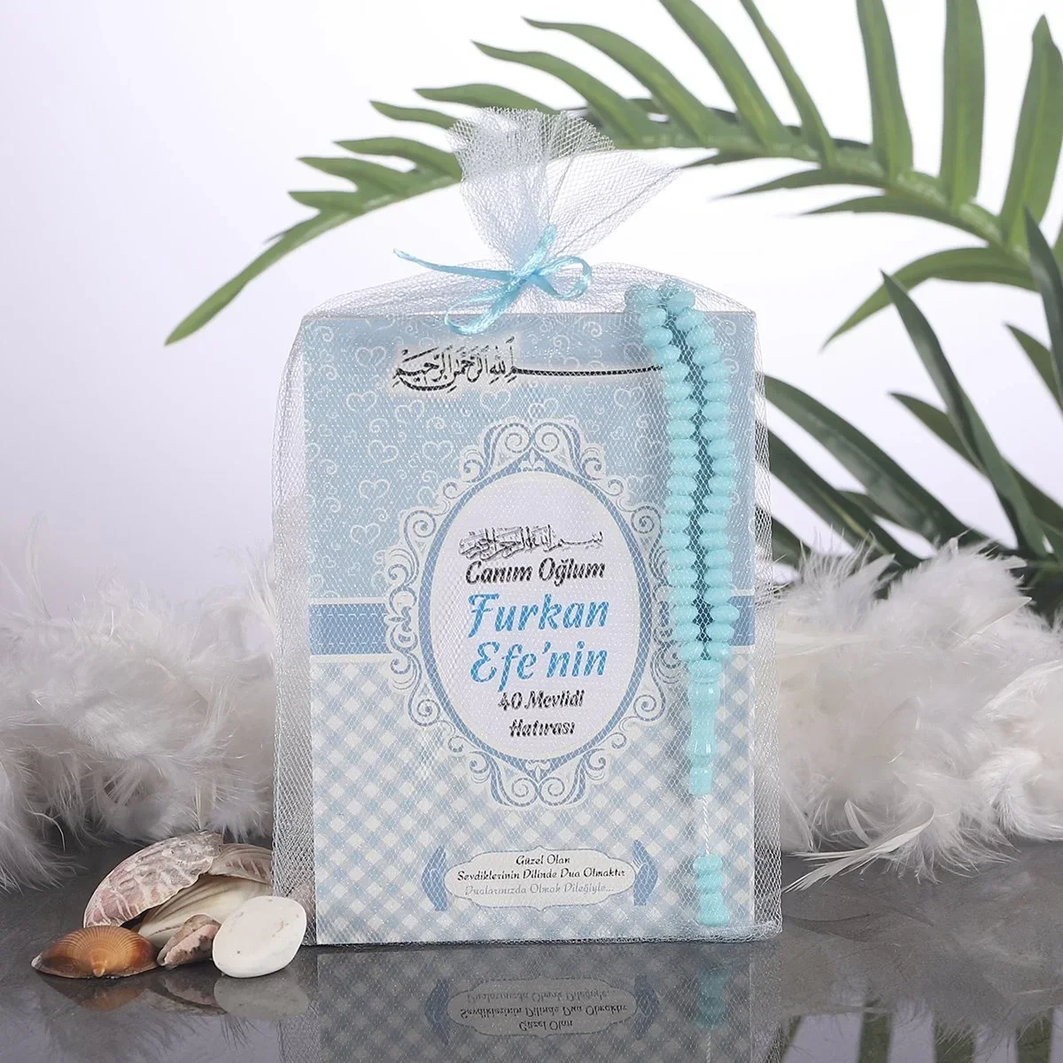 Erkek Bebek Mevlütleri için ideal olan bu set, yeni doğan bebekleri olan aileler tarafından sıkça tercih edilir. Kalp Model Mavi Renkli Tül Kese içindeki Yasin Kitabı ve Tesbih, içeriğinde barındırdığı anlam dolu dualar ile sevdiklerinizin dua anlarını daha özel kılar.