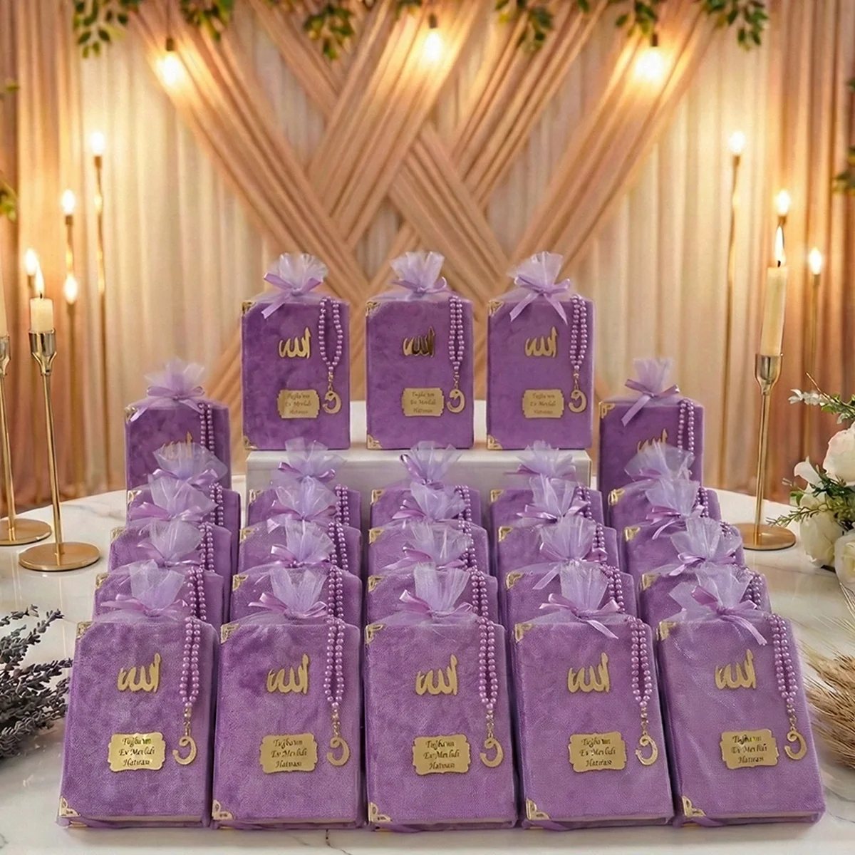 Tül Kese İçerisinde İnci Tesbihli Lila Renkli Kadife Yasin Kitabı Seti - Mevlüt Hediyelikleri