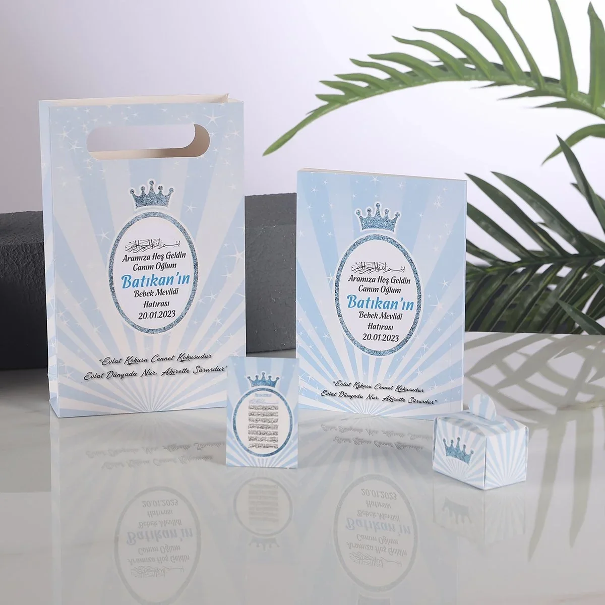 Taç Model Mavi Renkli Yasin Kitabı, Lokum Kutusu, Magnet ve Karton Çanta - Mevlüt Hediyelikleri