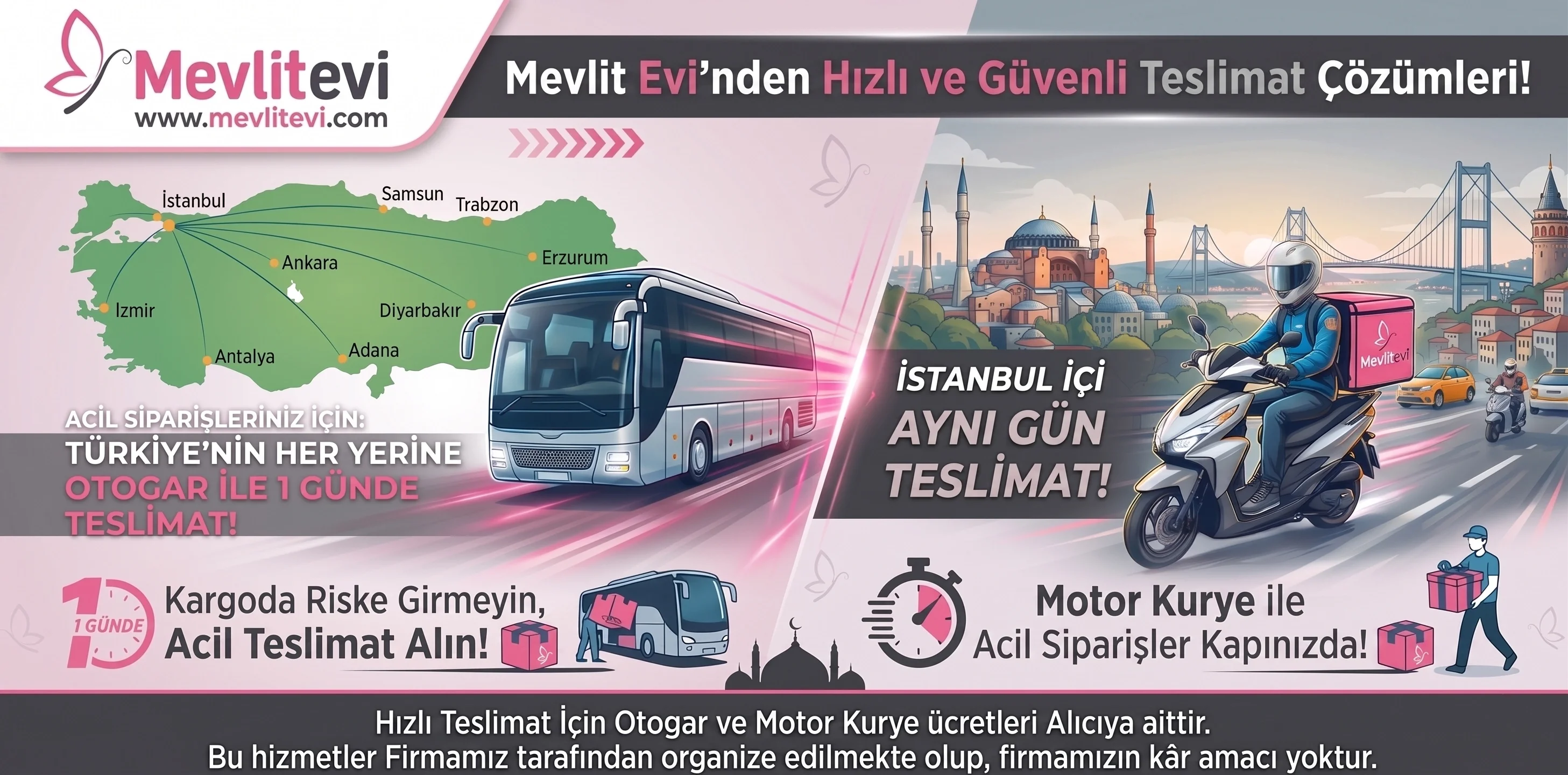 Mevlit Evi, Türkiye geneline hızlı ve güvenilir kargo hizmeti sunar. Mevlüt Hediyelikleri siparişleriniz, özenle paketlenip zamanında adresinize ulaştırılır. Müşterilerimizin beklentilerini aşmak ve özel günlerine eksiksiz bir şekilde katkıda bulunmak için elimizden gelenin en iyisini yapmak için çaba sarf ediyoruz.