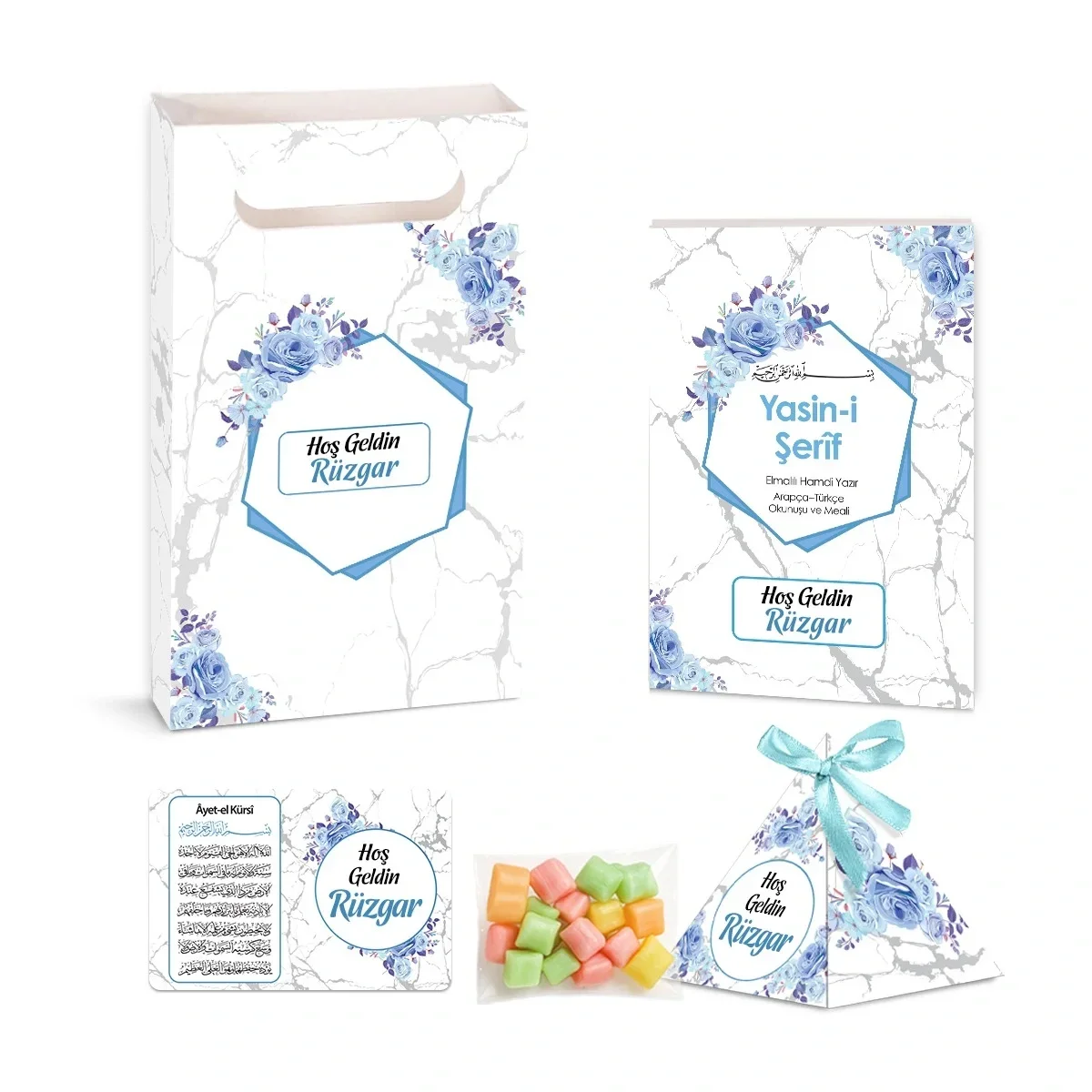 Altıgen Model Mavi Renkli Yasin Kitabı, Piramit Külah, Mevlüt Şekeri, Ayet-el Kürsi Magnet, Karton Çanta - Mevlüt Hediyelikleri
