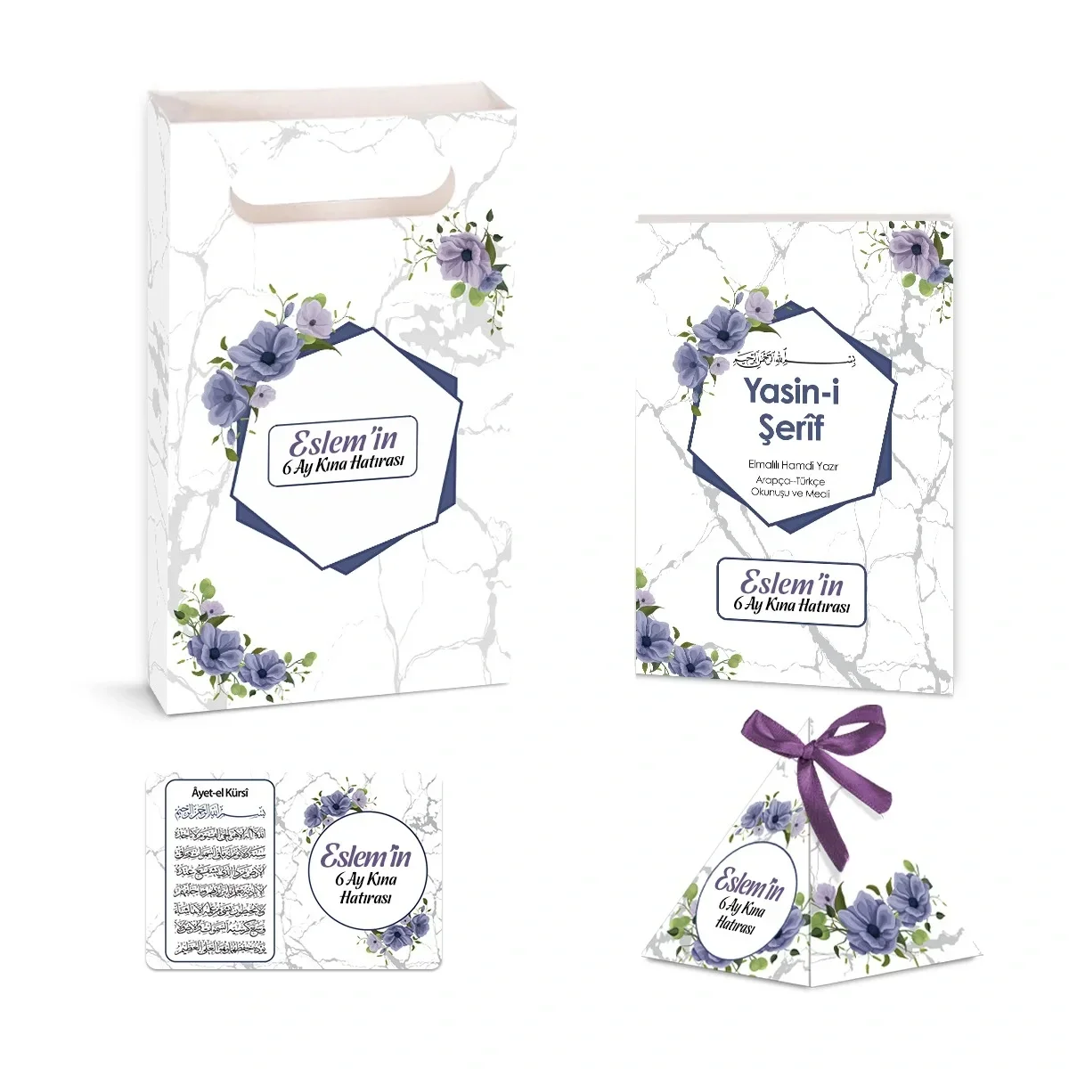 Altıgen Model Mor Renkli Yasin Kitabı, Piramit Külah, Ayet-el Kürsi Magnet, Karton Çanta - Mevlüt Hediyelikleri