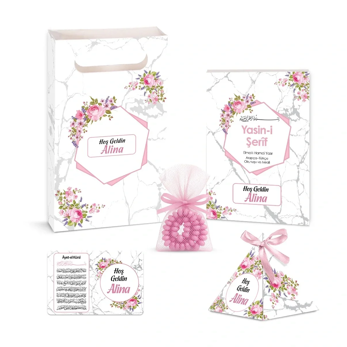 Altıgen Model Pembe Renkli Yasin Kitabı, Piramit Külah, Ayet-el Kürsi Magnet, Karton Çanta ve Tesbih - Mevlüt Hediyelikleri