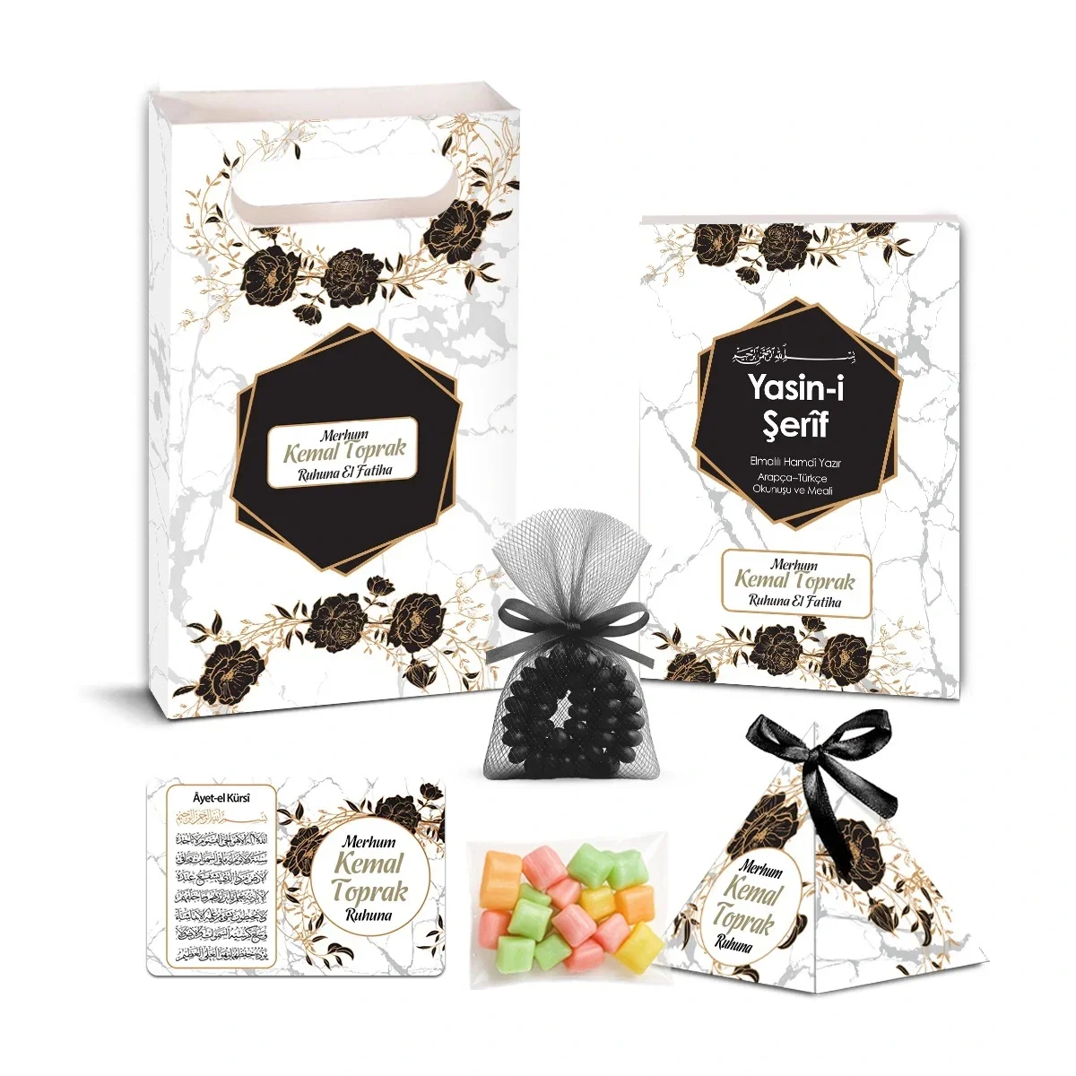 Altıgen Model Siyah Renkli Yasin Kitabı, Piramit Külah, Mevlüt Şekeri, Ayet-el Kürsi Magnet, Karton Çanta ve Tesbih - Mevlüt Hediyelikleri