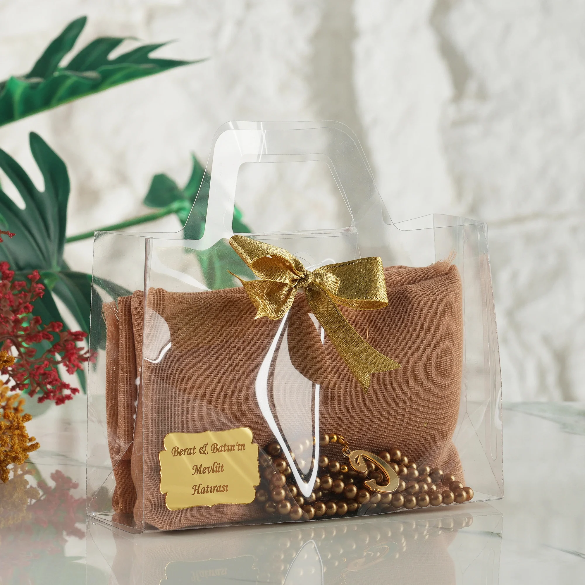 Goldnun asaletiyle hazırlanan bu özel set; şeffaf asetat çantası ve kurdele süslemesiyle davetlilerinize özenle hazırlanmış bir sunum yapmanızı sağlar. Üzerine eklenen isme özel pleksi ile merhumun, bebeğinizin veya özel gün sahibinin adını hatıralarda yaşatabilirsiniz.