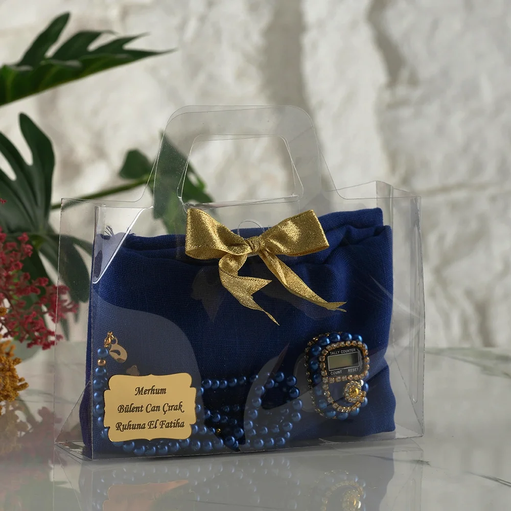 Saks Mavisiın asaletiyle hazırlanan bu özel set; şeffaf asetat çantası ve kurdele süslemesiyle davetlilerinize özenle hazırlanmış bir sunum yapmanızı sağlar. Üzerine eklenen isme özel pleksi ile merhumun, bebeğinizin veya özel gün sahibinin adını hatıralarda yaşatabilirsiniz.