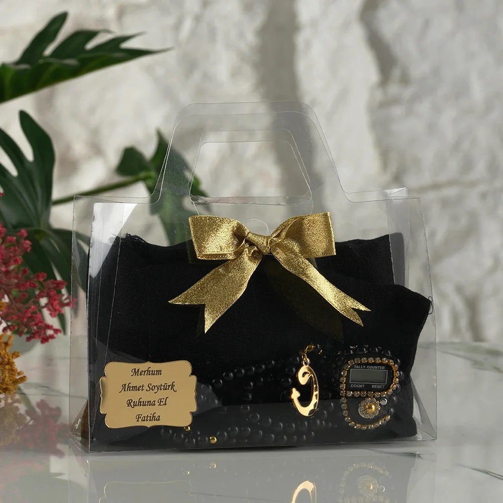 Siyahnun asaletiyle hazırlanan bu özel set; şeffaf asetat çantası ve kurdele süslemesiyle davetlilerinize özenle hazırlanmış bir sunum yapmanızı sağlar. Üzerine eklenen isme özel pleksi ile merhumun, bebeğinizin veya özel gün sahibinin adını hatıralarda yaşatabilirsiniz.