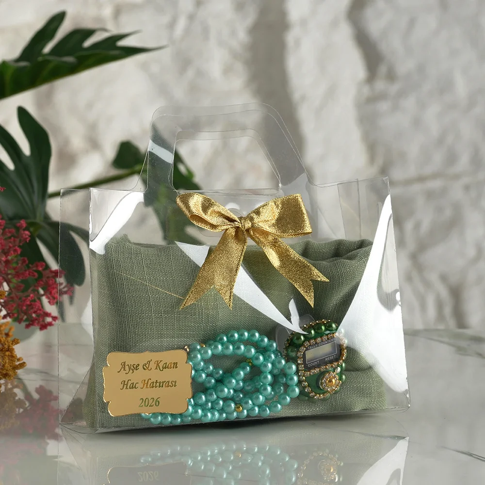Su Yeşiliın asaletiyle hazırlanan bu özel set; şeffaf asetat çantası ve kurdele süslemesiyle davetlilerinize özenle hazırlanmış bir sunum yapmanızı sağlar. Üzerine eklenen isme özel pleksi ile merhumun, bebeğinizin veya özel gün sahibinin adını hatıralarda yaşatabilirsiniz.