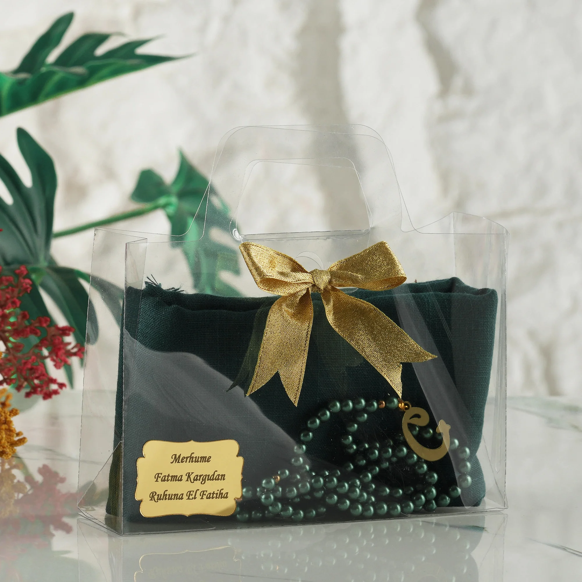 Zümrütnun asaletiyle hazırlanan bu özel set; şeffaf asetat çantası ve kurdele süslemesiyle davetlilerinize özenle hazırlanmış bir sunum yapmanızı sağlar. Üzerine eklenen isme özel pleksi ile merhumun, bebeğinizin veya özel gün sahibinin adını hatıralarda yaşatabilirsiniz.