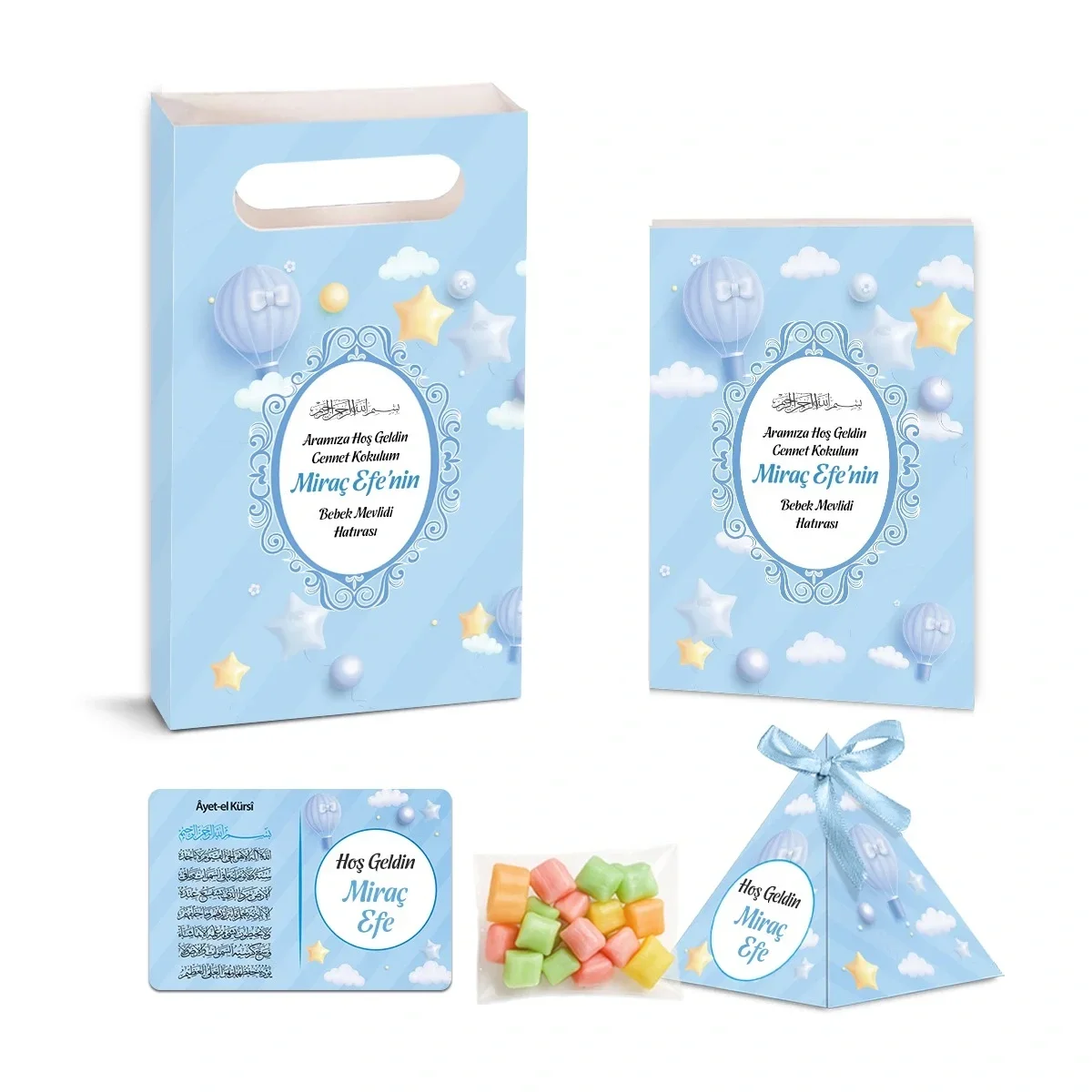 Balon Model Mavi Renkli Yasin Kitabı, Piramit Külah, Mevlüt Şekeri, Ayet-el Kürsi Magnet, Karton Çanta - Mevlüt Hediyelikleri
