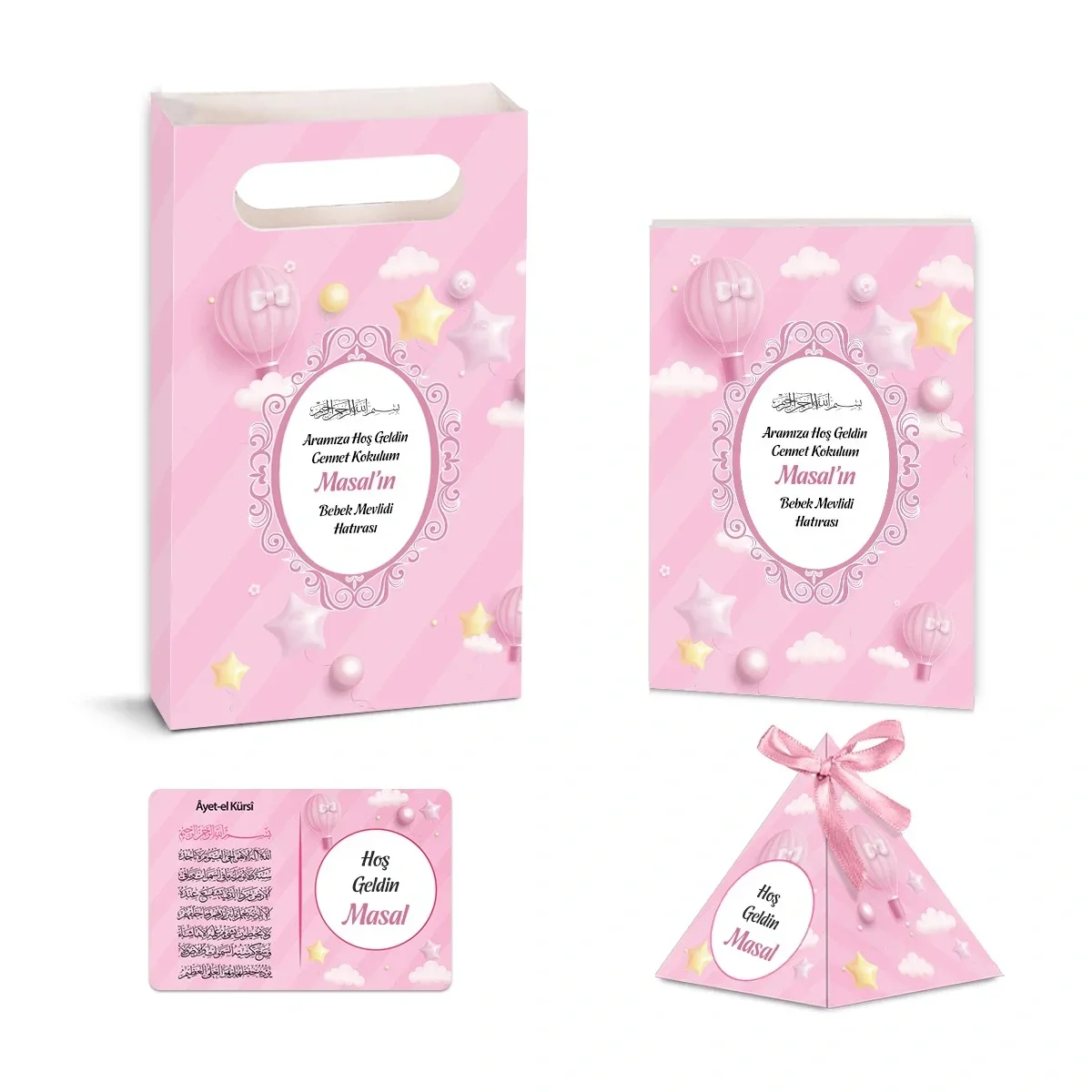 Balon Model Pembe Renkli Yasin Kitabı, Piramit Külah, Ayet-el Kürsi Magnet, Karton Çanta - Mevlüt Hediyelikleri