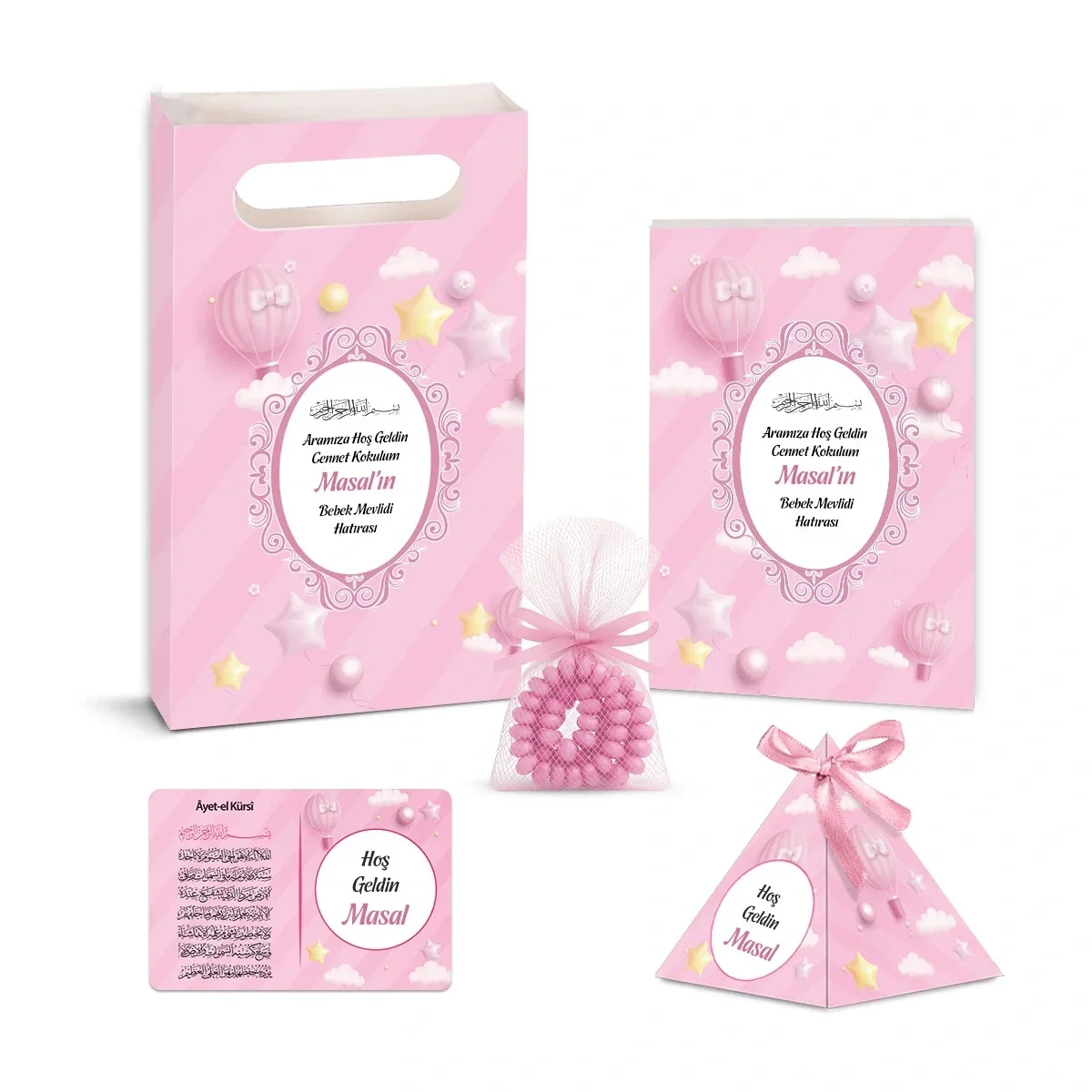 Balon Model Pembe Renkli Yasin Kitabı, Piramit Külah, Ayet-el Kürsi Magnet, Karton Çanta ve Tesbih - Mevlüt Hediyelikleri