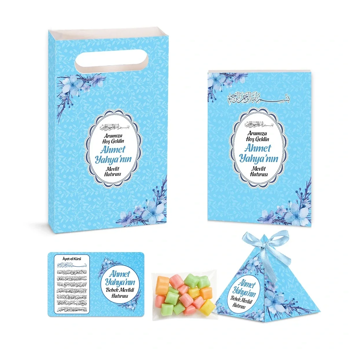 Çiçek Model Mavi Renkli Yasin Kitabı, Piramit Külah, Mevlüt Şekeri, Ayet-el Kürsi Magnet, Karton Çanta - Mevlüt Hediyelikleri