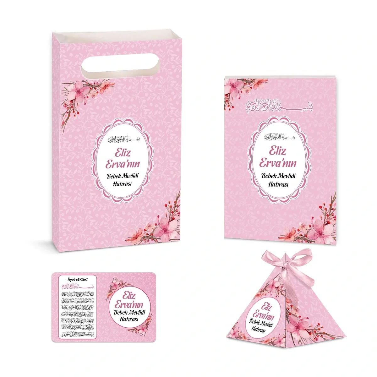 Çiçek Model Pembe Renkli Yasin Kitabı, Piramit Külah, Ayet-el Kürsi Magnet, Karton Çanta - Mevlüt Hediyelikleri