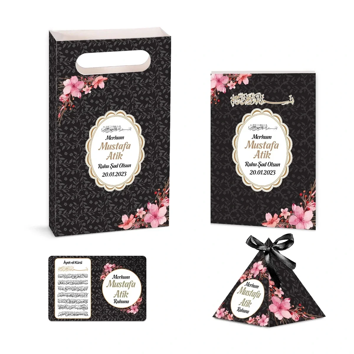 Çiçek Model Siyah Renkli Yasin Kitabı, Piramit Külah, Ayet-el Kürsi Magnet, Karton Çanta - Mevlüt Hediyelikleri