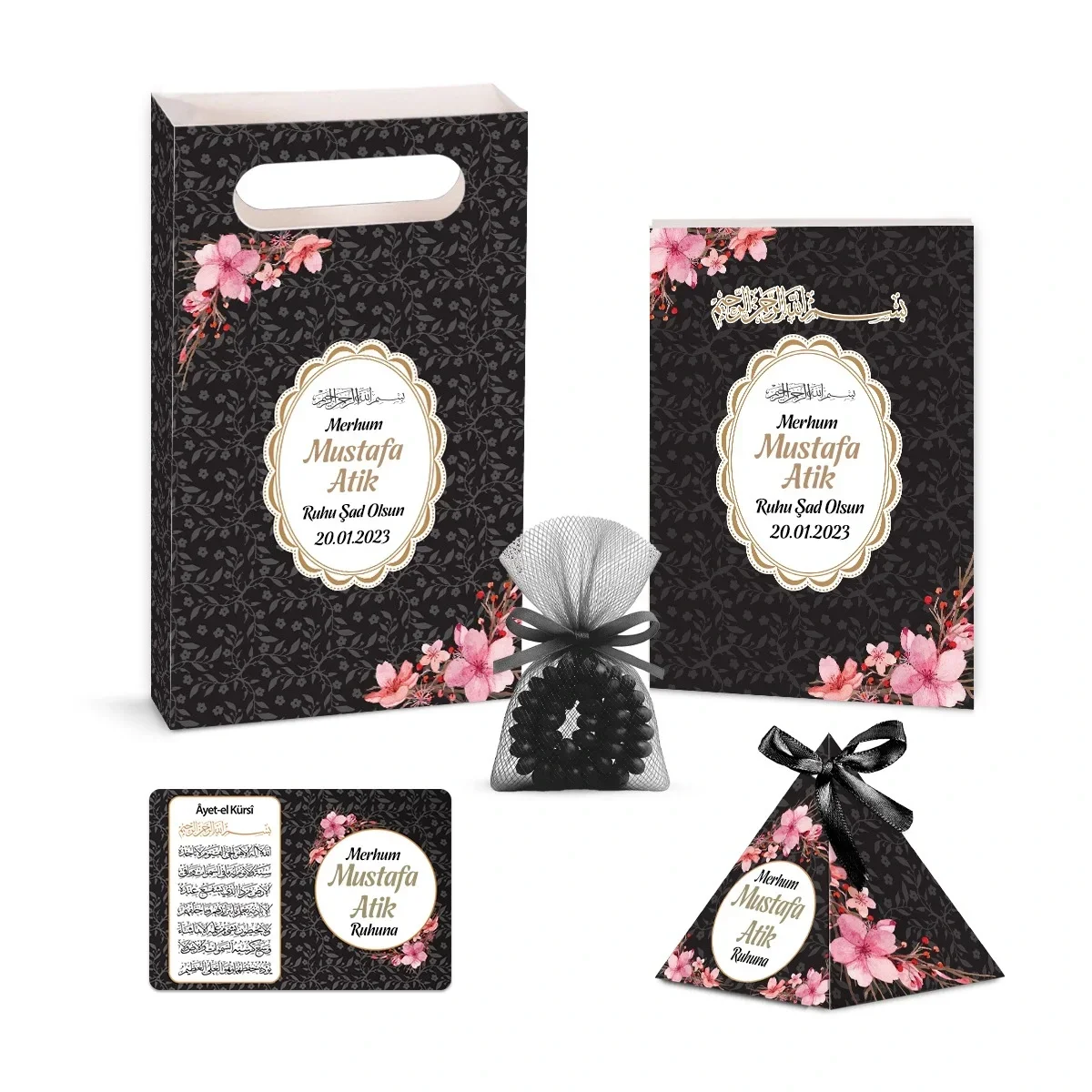Çiçek Model Siyah Renkli Yasin Kitabı, Piramit Külah, Ayet-el Kürsi Magnet, Karton Çanta ve Tesbih - Mevlüt Hediyelikleri