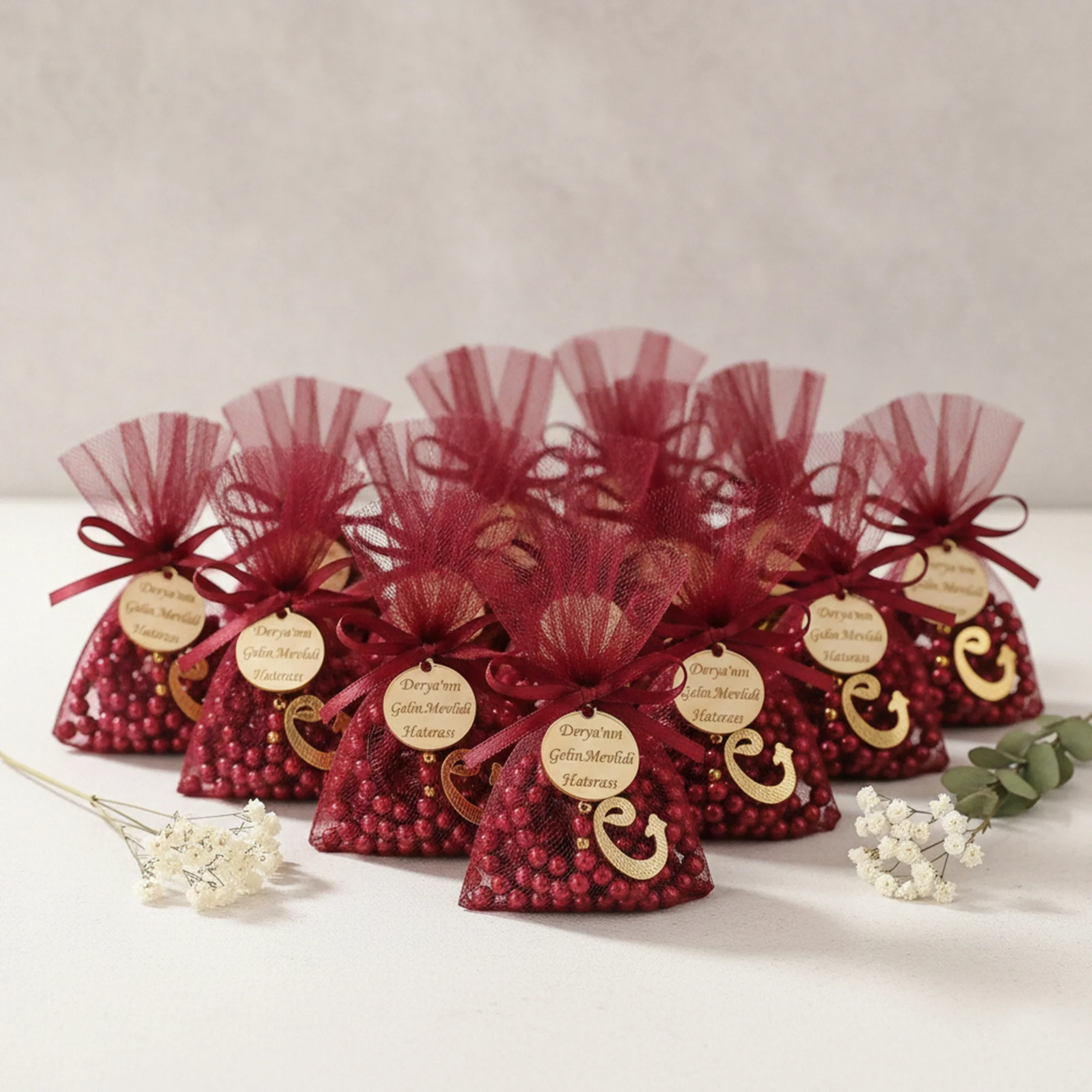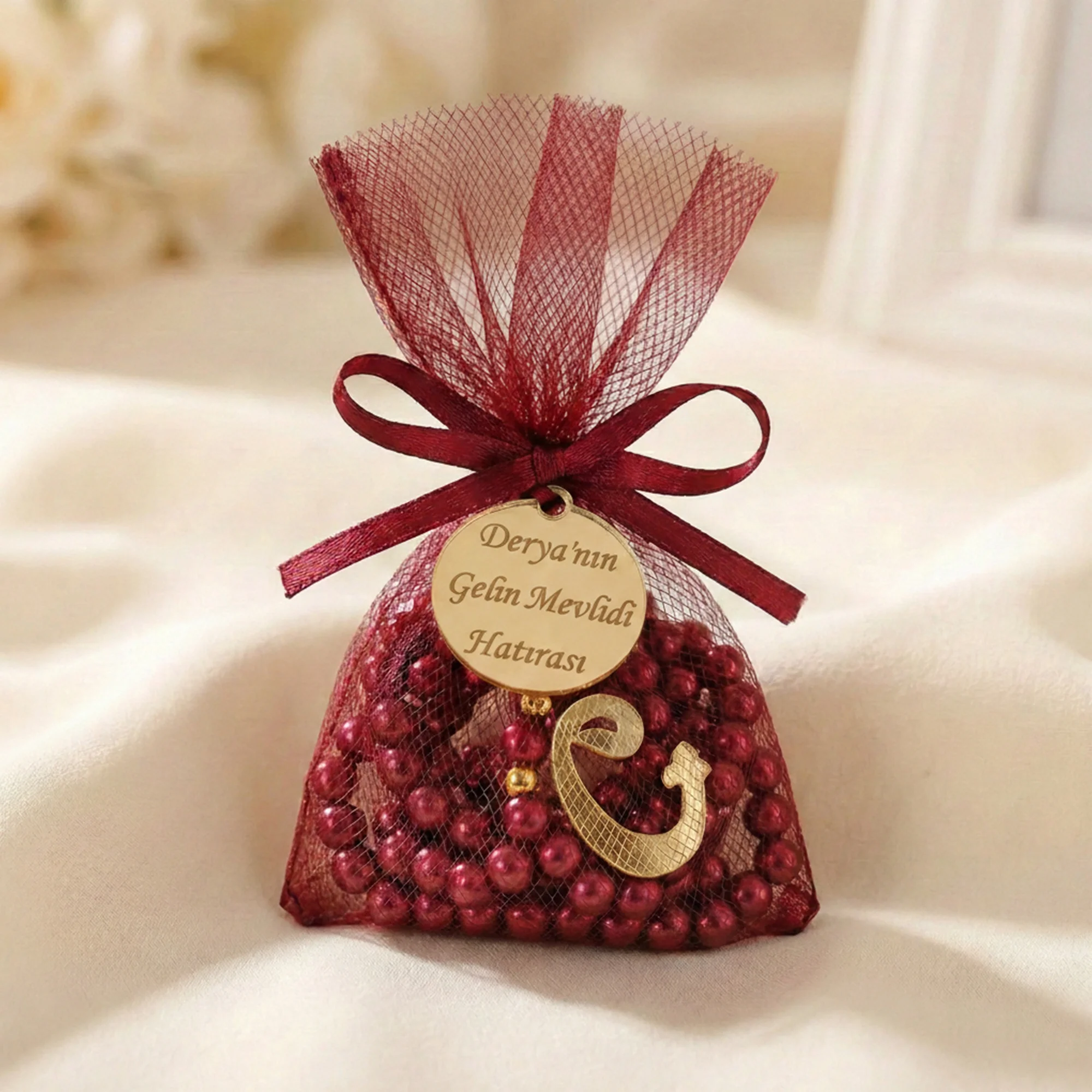 Zarafetin ve maneviyatın buluştuğu bu özel set, sevdiklerinize sunabileceğiniz en anlamlı hediyeliklerden biridir. Tül Kese İçerisinde İsme Özel Bordo Renkli İnci Tesbih, şık sunumu ve kişiselleştirilebilir detaylarıyla hem hüzünlü hem de mutlu günlerinizde yanınızda.
