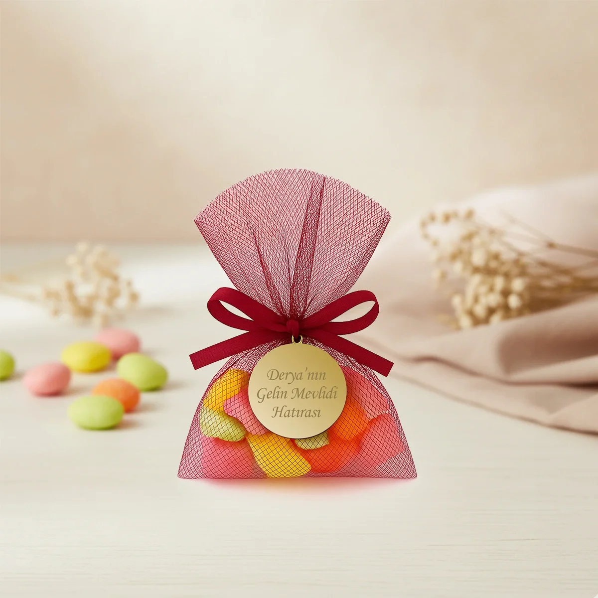 Bordo renkli tül kese içerisinde sunulan meyveli akide şekeri, ön kısmındaki isme özel pleksi ile mevlütlerinizde misafirlere sade ve zarif bir hatıra olarak ikram edilebilir.
