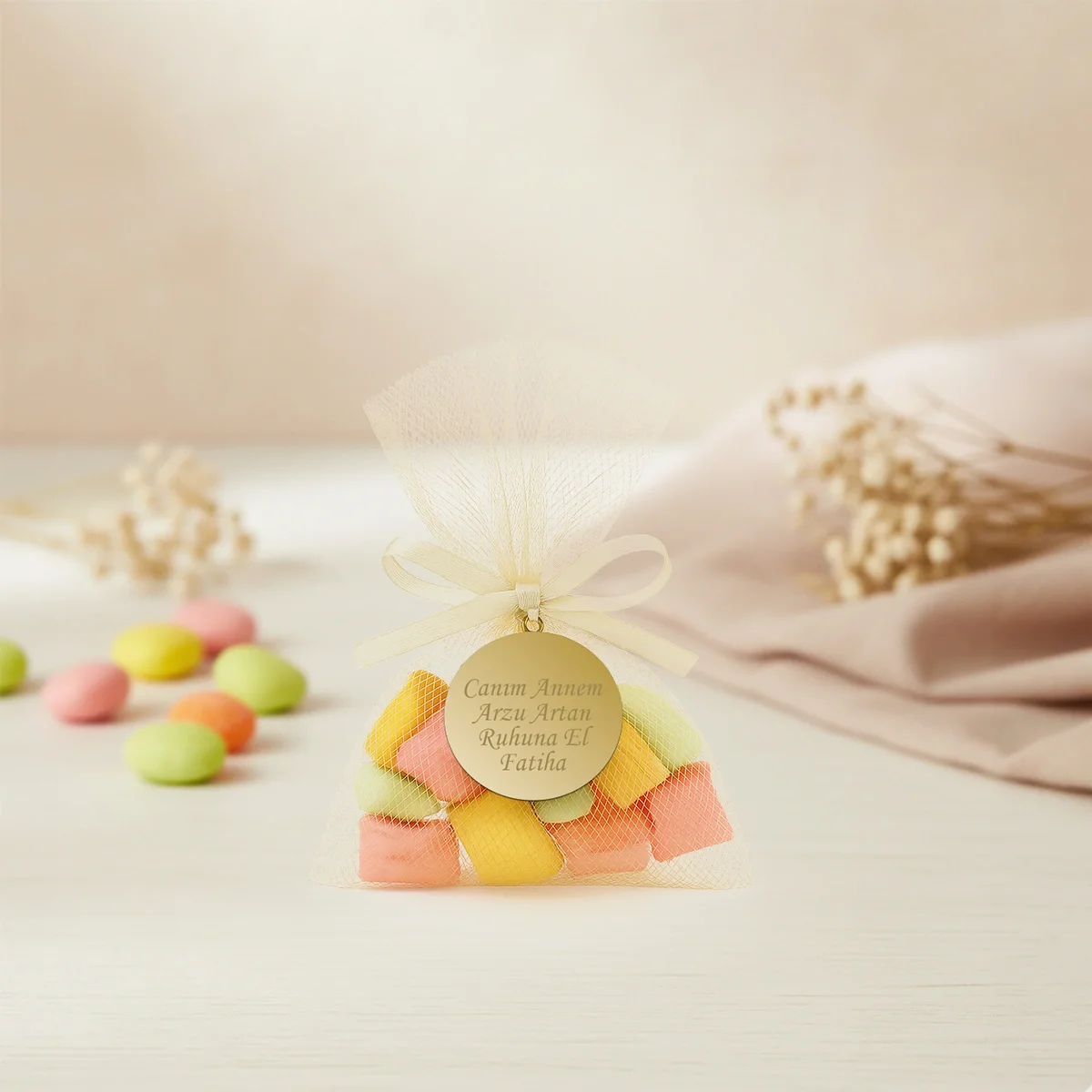 Krem renkli tül kese içerisinde sunulan meyveli akide şekeri, ön kısmındaki isme özel pleksi ile mevlütlerinizde misafirlere sade ve zarif bir hatıra olarak ikram edilebilir.