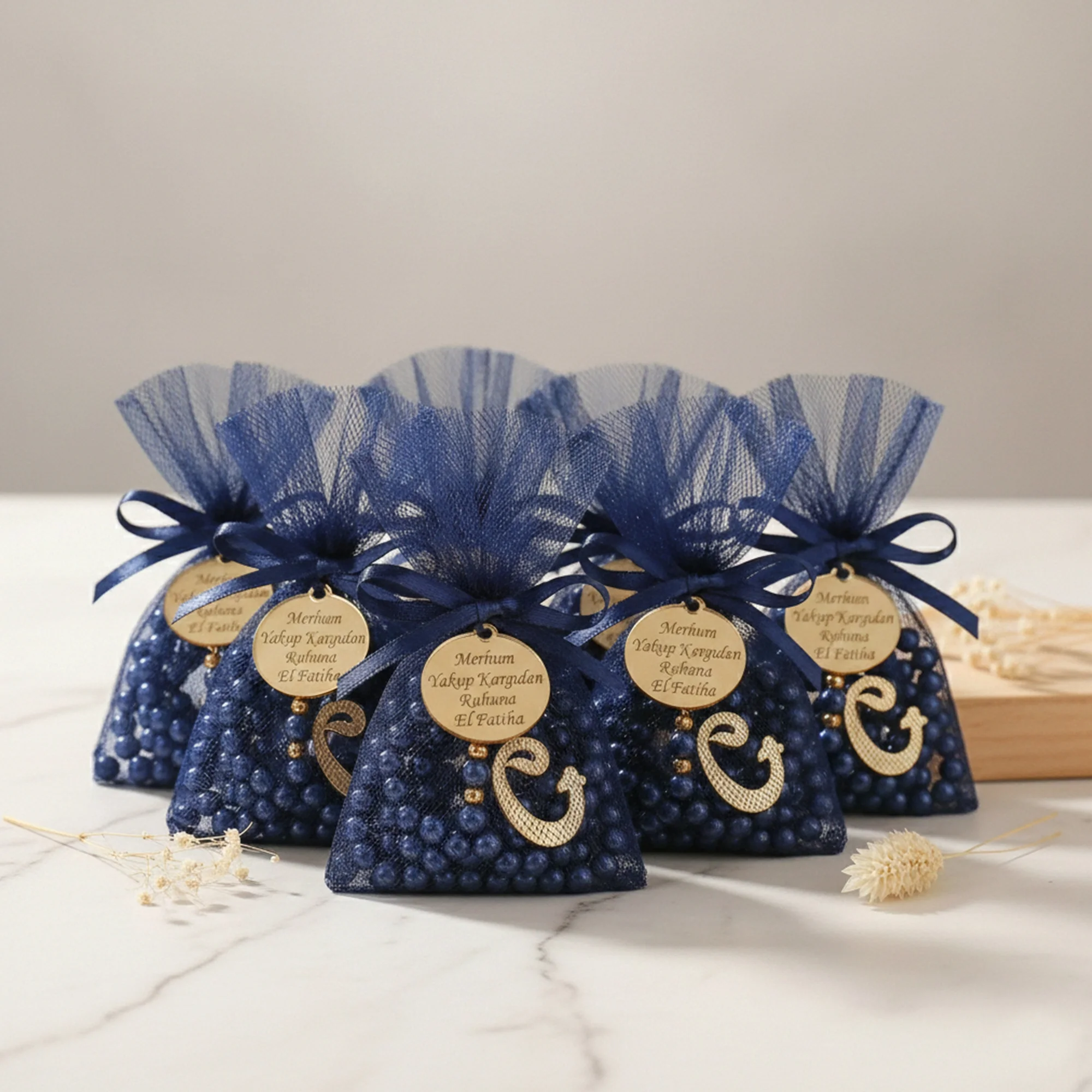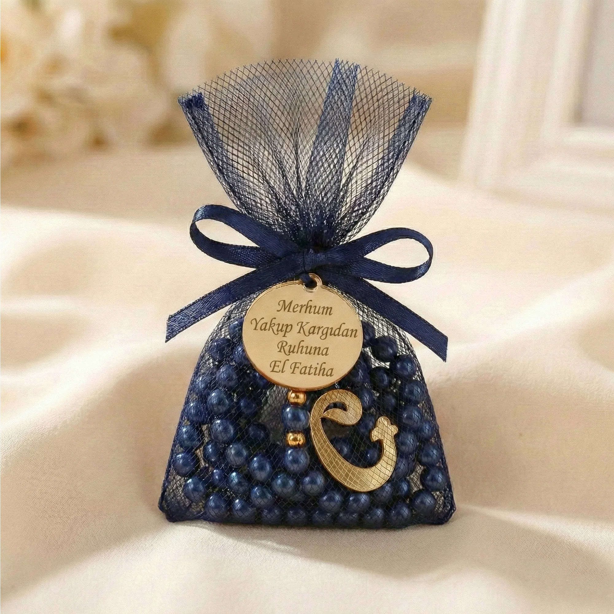 Zarafetin ve maneviyatın buluştuğu bu özel set, sevdiklerinize sunabileceğiniz en anlamlı hediyeliklerden biridir. Tül Kese İçerisinde İsme Özel Lacivert Renkli İnci Tesbih, şık sunumu ve kişiselleştirilebilir detaylarıyla hem hüzünlü hem de mutlu günlerinizde yanınızda.