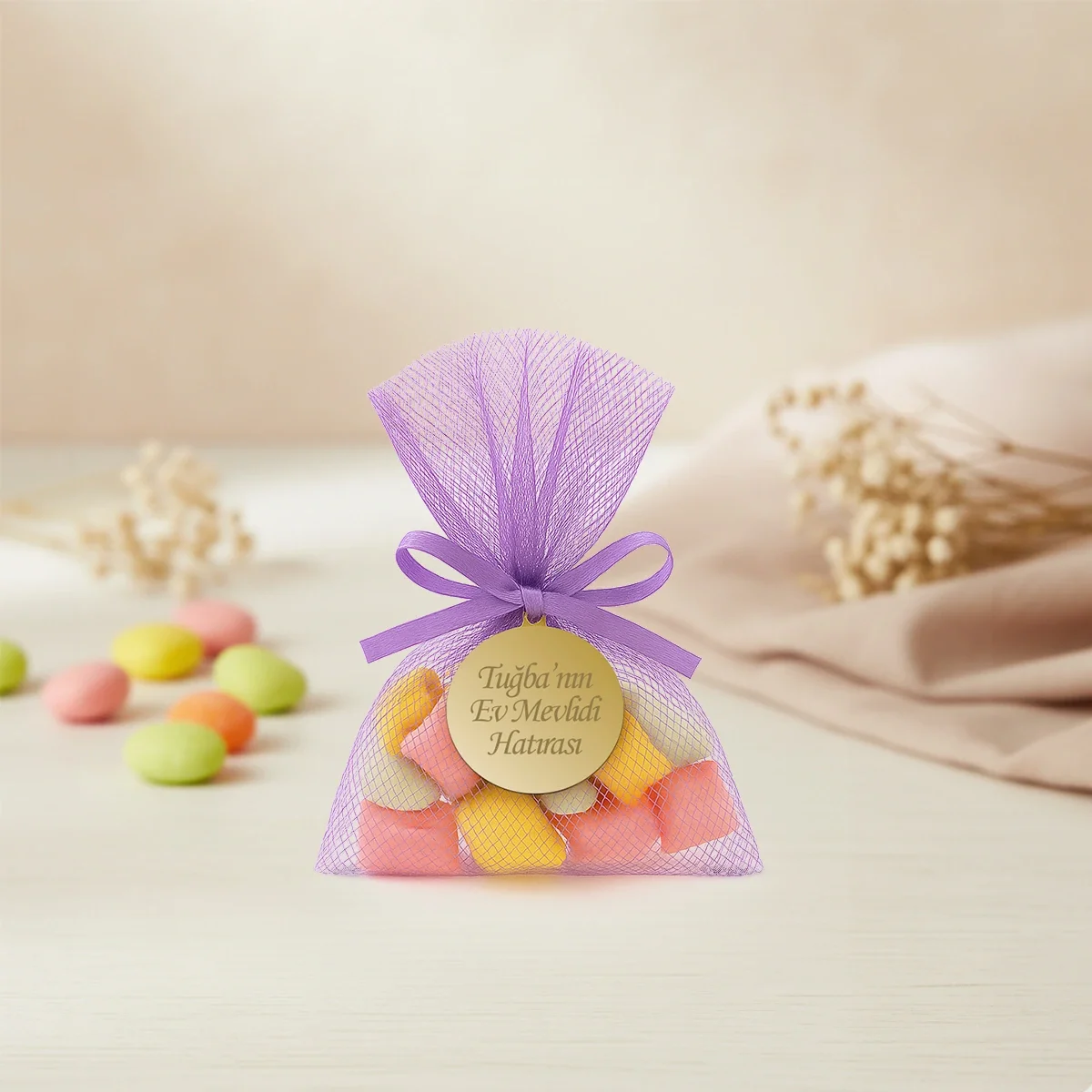 Lila renkli tül kese içerisinde sunulan meyveli akide şekeri, ön kısmındaki isme özel pleksi ile mevlütlerinizde misafirlere sade ve zarif bir hatıra olarak ikram edilebilir.