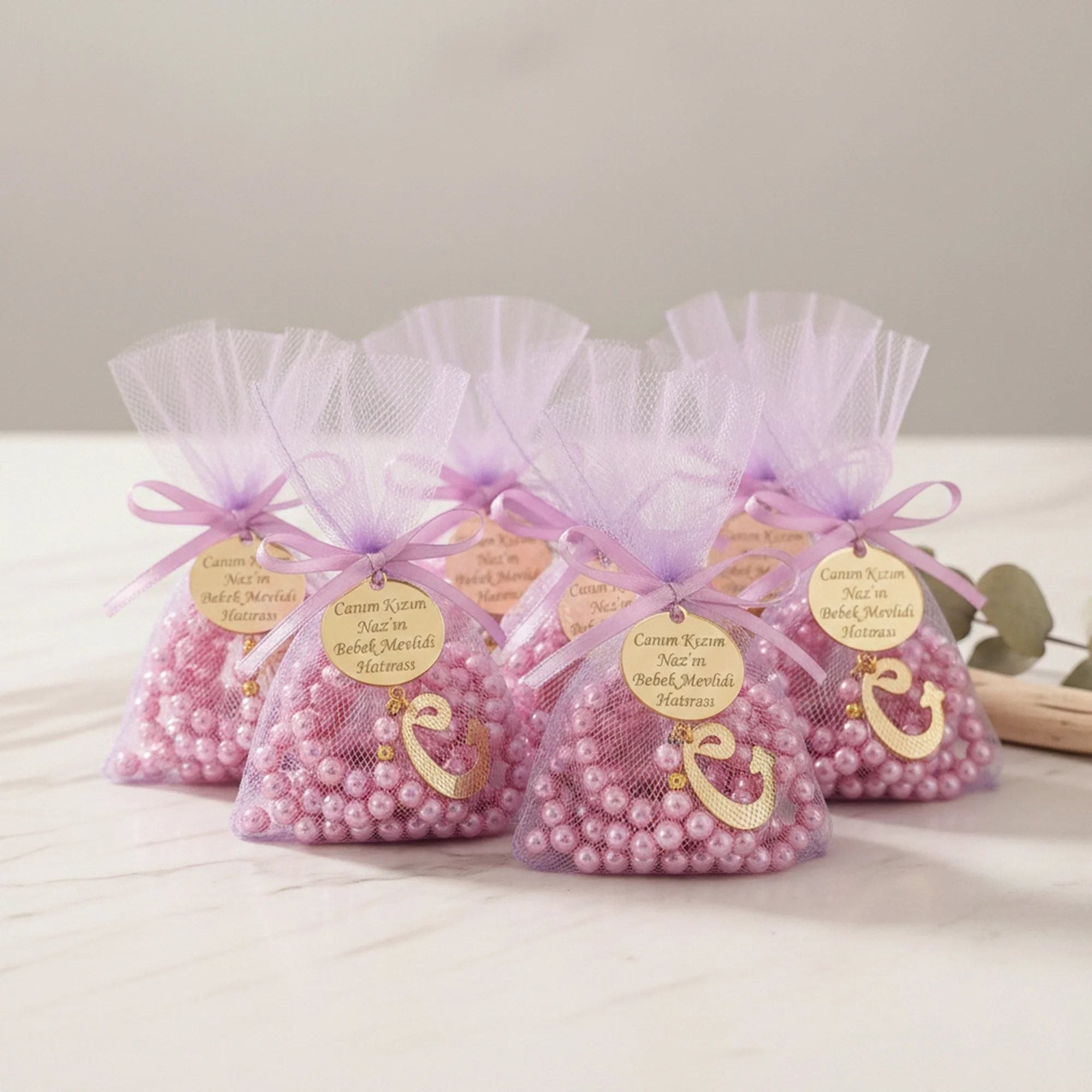 Tül kesenin kurdelesine bağlanan isme özel pleksi ile merhumun adını hayırla yad ettirebilir veya bebeğinizin ismini ölümsüzleştirebilirsiniz. İçerisindeki parlak inci görünümlü tesbih, misafirlerinizin her kullanımda sizi hatırlayacağı kalıcı bir hatıradır.