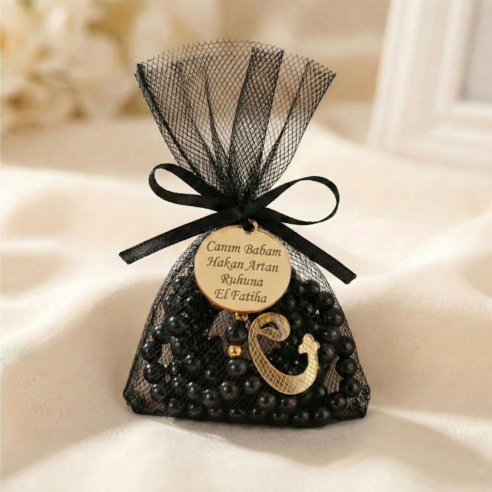 Zarafetin ve maneviyatın buluştuğu bu özel set, sevdiklerinize sunabileceğiniz en anlamlı hediyeliklerden biridir. Tül Kese İçerisinde İsme Özel Siyah Renkli İnci Tesbih, şık sunumu ve kişiselleştirilebilir detaylarıyla hem hüzünlü hem de mutlu günlerinizde yanınızda.