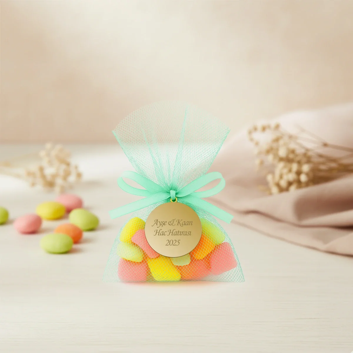 Su Yeşili renkli tül kese içerisinde sunulan meyveli akide şekeri, ön kısmındaki isme özel pleksi ile mevlütlerinizde misafirlere sade ve zarif bir hatıra olarak ikram edilebilir.
