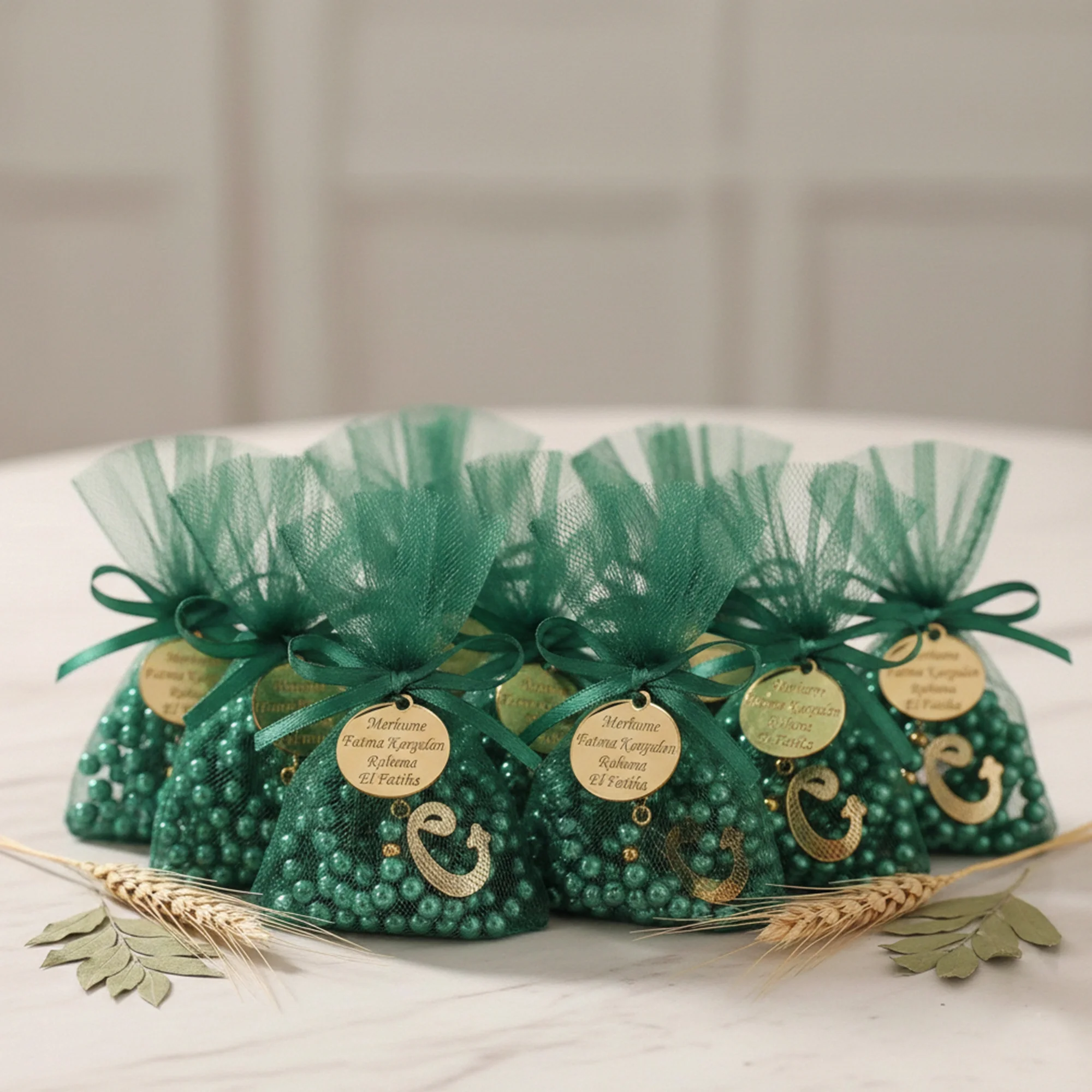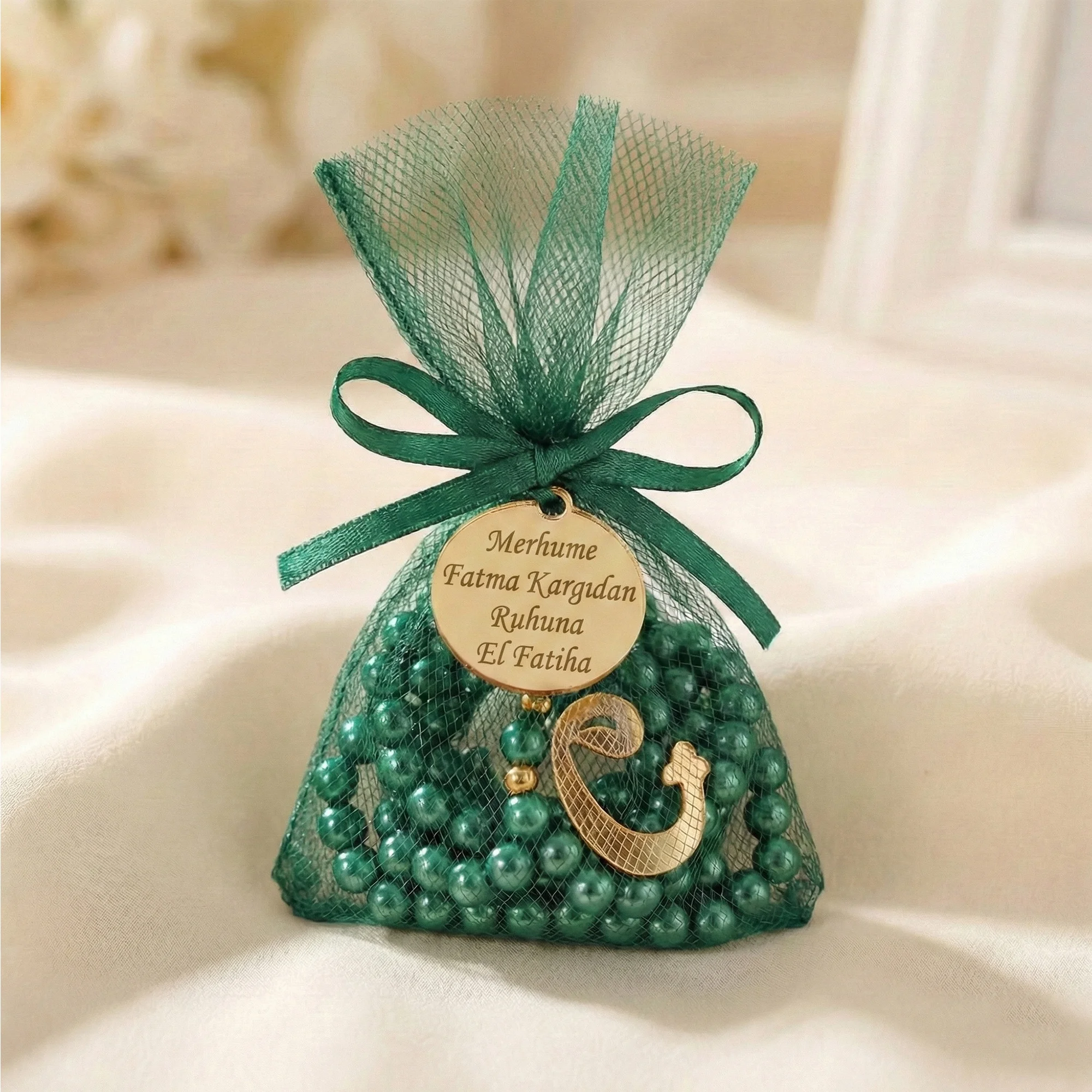 Zarafetin ve maneviyatın buluştuğu bu özel set, sevdiklerinize sunabileceğiniz en anlamlı hediyeliklerden biridir. Tül Kese İçerisinde İsme Özel Zümrüt Renkli İnci Tesbih, şık sunumu ve kişiselleştirilebilir detaylarıyla hem hüzünlü hem de mutlu günlerinizde yanınızda.