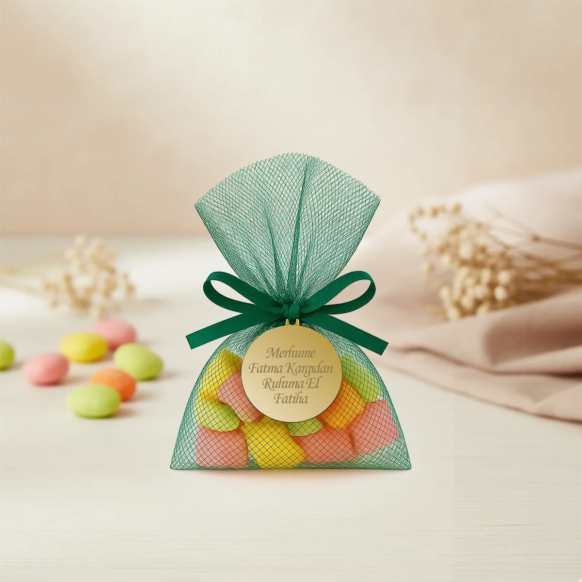 Zümrüt renkli tül kese içerisinde sunulan meyveli akide şekeri, ön kısmındaki isme özel pleksi ile mevlütlerinizde misafirlere sade ve zarif bir hatıra olarak ikram edilebilir.