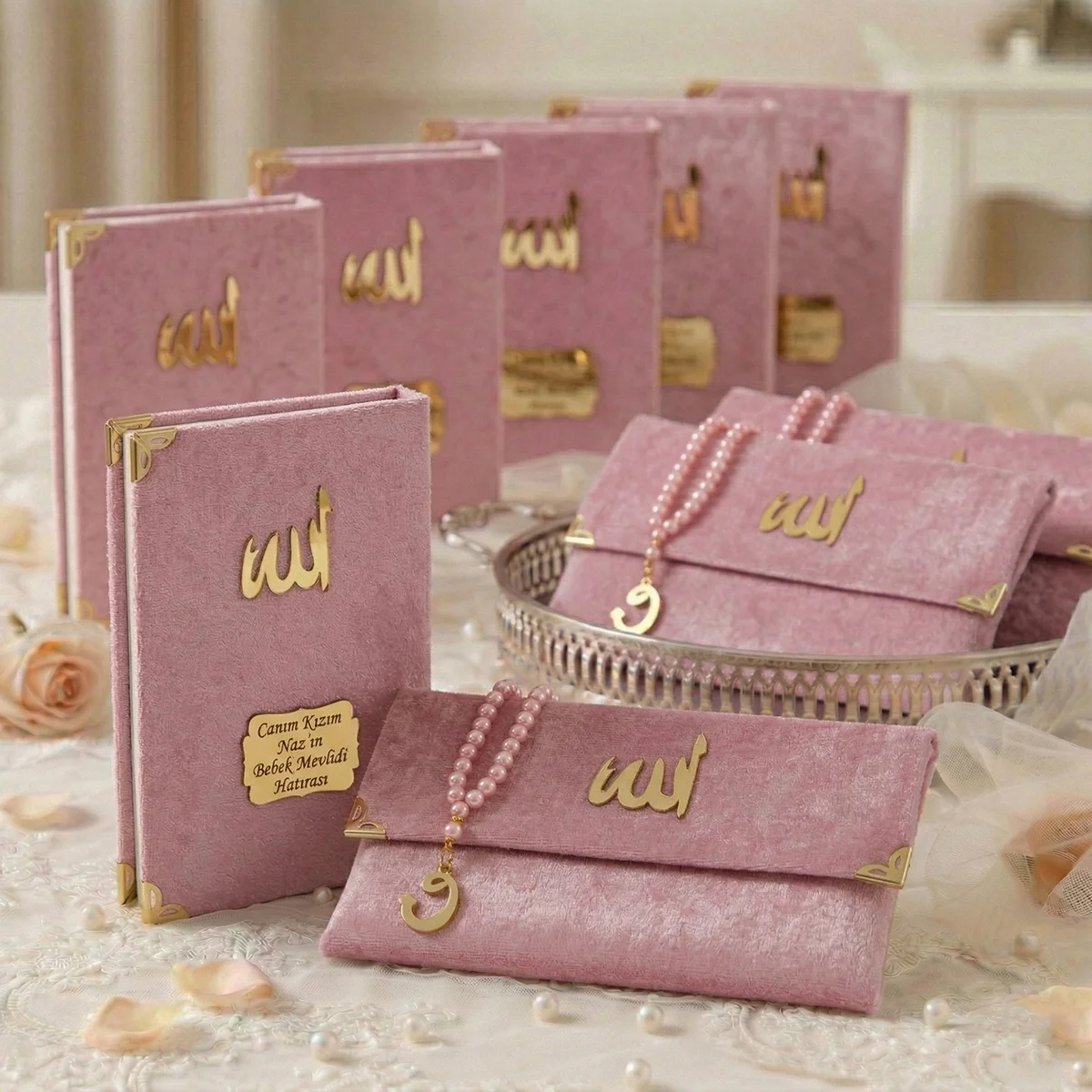 Kadife Kumaş Kaplı Çanta İçerisinde İnci Tesbihli Pembe Renkli Kadife Yasin Kitabı Seti, lüks kumaşı ve anlam dolu dualarıyla öne çıkan özel bir mevlüt hediyeliğidir. Kaliteli Kadife Kumaşıyla dikkat çeken bu ürünümüz, manevi anlamıyla özel bir hediye sunma amacını taşır.