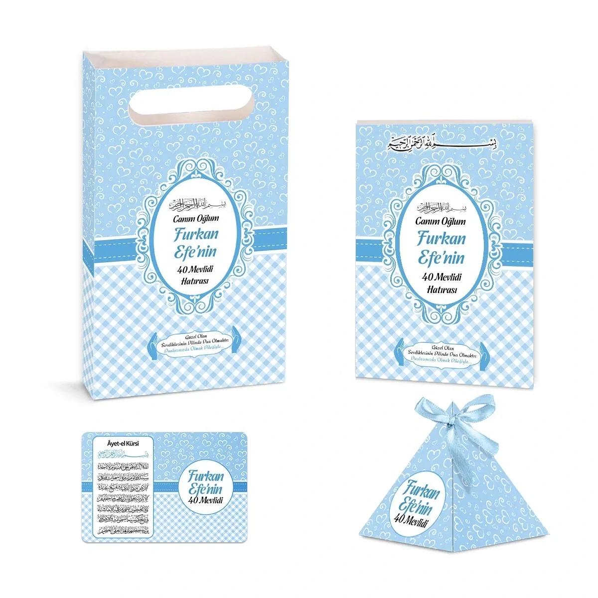 Kalp Model Mavi Renkli Yasin Kitabı, Piramit Külah, Ayet-el Kürsi Magnet, Karton Çanta - Mevlüt Hediyelikleri