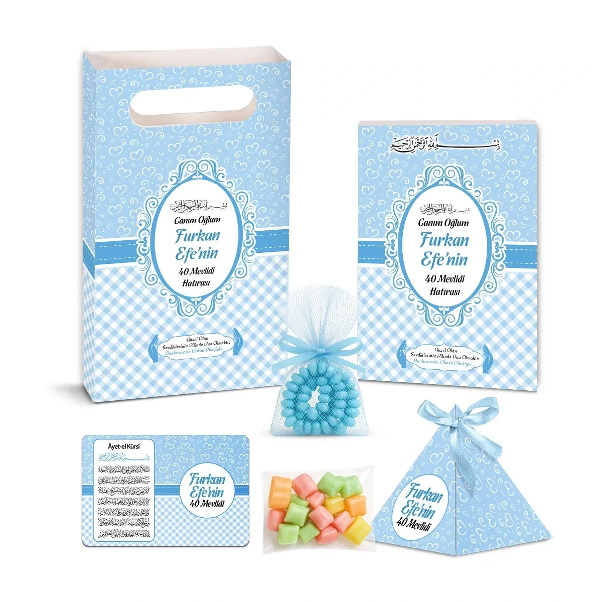 Kalp Model Mavi Renkli Yasin Kitabı, Piramit Külahı, Mevlüt Şekeri, Ayet-el Kürsi Magneti Karton Çanta ve Tesbih ile mevlütlerinizde en şık ve kaliteli mevlüt hediyelikleri dağıtın. Aynı gün kargo imkanı, kapıda ödeme seçeneği, ücretsiz iade ve değişim kolaylığı.