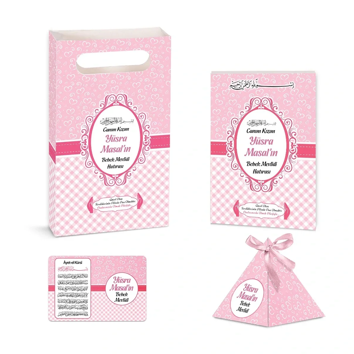 Kalp Model Pembe Renkli Yasin Kitabı, Piramit Külah, Ayet-el Kürsi Magnet, Karton Çanta - Mevlüt Hediyelikleri