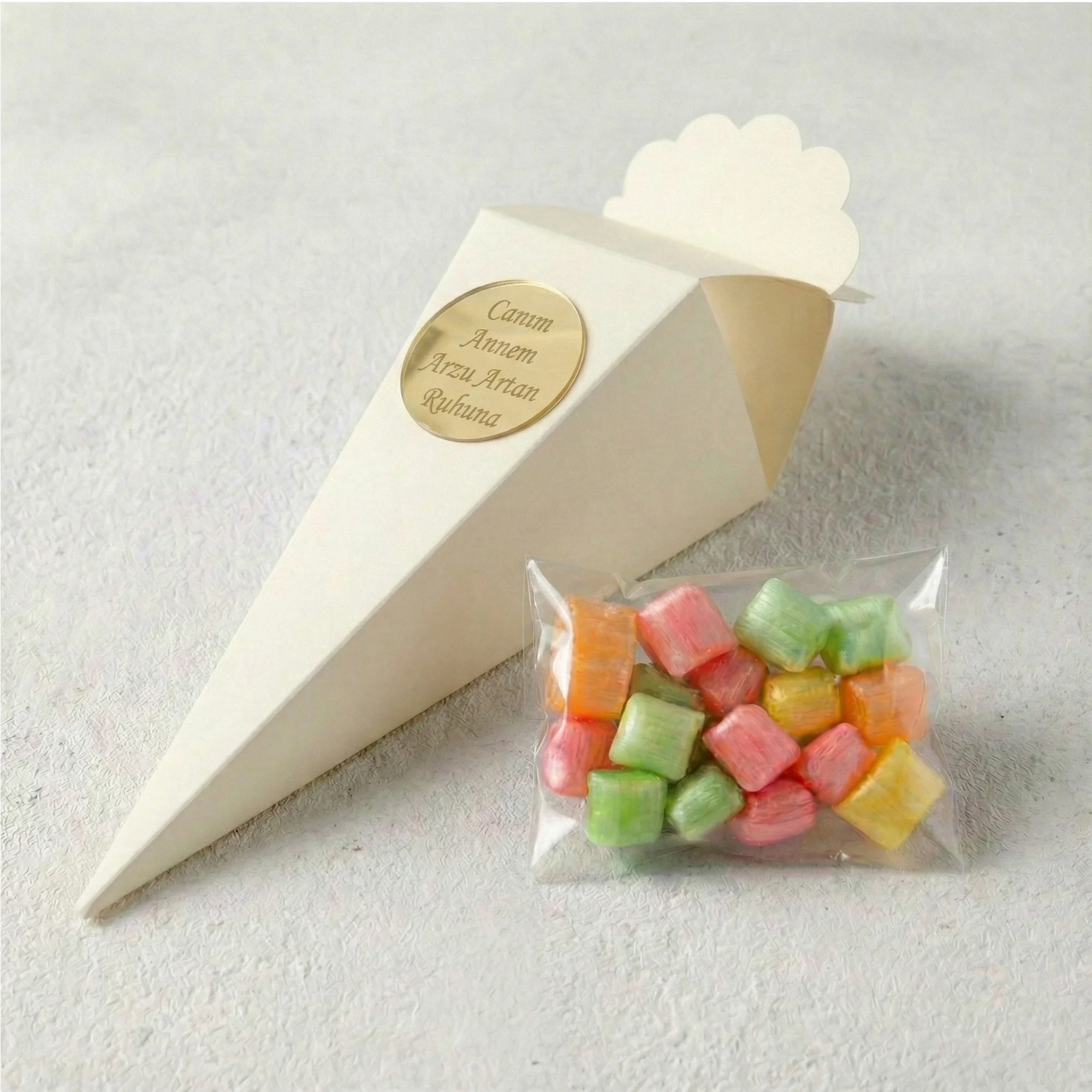 Ürünleriniz, kargo sürecinde külah kutuların ezilmemesi ve hijyenik koşulların korunması adına demonte olarak gönderilmektedir. Külah kutu (açık halde), ambalajlı şeker ve isme özel pleksi ayrı ayrı paketlenir. Külahı katlamak, şekeri içine koymak ve pleksiyi yapıştırmak oldukça kolay ve pratiktir.