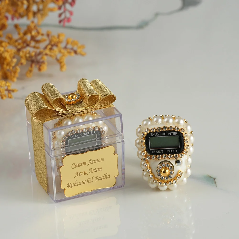 Mika Kutuda Taşlı Krem Renkli Zikirmatik, üzerindeki inci ve parlak taş detaylarıyla sıradan zikirmatiklerden ayrılır, misafirlerinize kendilerini özel hissettirir.