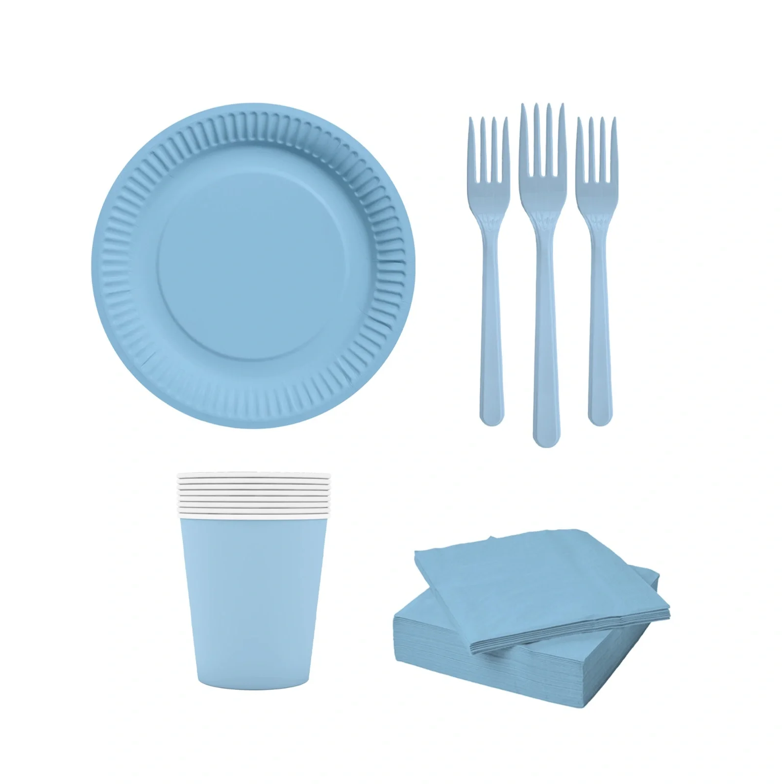 Pastel mavi tonuyla hazırlanan bu tek kullanımlık sofra seti, bebek mevlüdü, doğum günü, baby shower ve pembe konseptli ikram masaları için eksiksiz ve pratik bir çözüm sunar. Şık görünümüyle masanızı tek adımda kutlamaya hazır hale getirir.