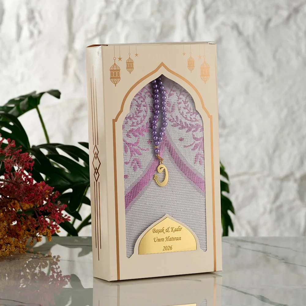 Bordo Renkli İsme Özel Dikey Kutu İçerisinde Seccade ve Tesbih Bordo renginin asil ve zarif tonu, misafire saygıyı hissettiren şık bir sunumla buluşuyor. Düğün, mevlit ve özel günlerin yanında vefat mevlidi ve taziye merasimlerinde de anlamlı bir hatıra olarak tercih edilir. Set İçeriği İsme özel baskılı dikey hediye kutusu İnci detaylı tesbih Kaliteli kumaştan seccade Öne Çıkan Özellikler Kişiye özel isim/mesaj baskısı ile hazırlanır. Dikey vitrin pencereli kutu ile zarif sunum. Uzun ömürlü, özenli üretim ve pratik saklama. Toplu alımlara uygundur; misafirlerinize sade, şık ve kalıcı bir hatıra bırakır.1. Aynı Gün Kargo İmkanı: