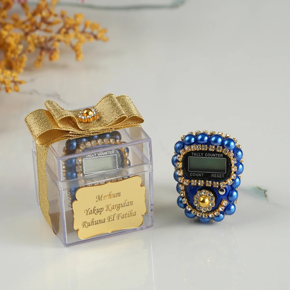 Mika Kutuda Taşlı Saks Mavisi Renkli Zikirmatik, üzerindeki inci ve parlak taş detaylarıyla sıradan zikirmatiklerden ayrılır, misafirlerinize kendilerini özel hissettirir.