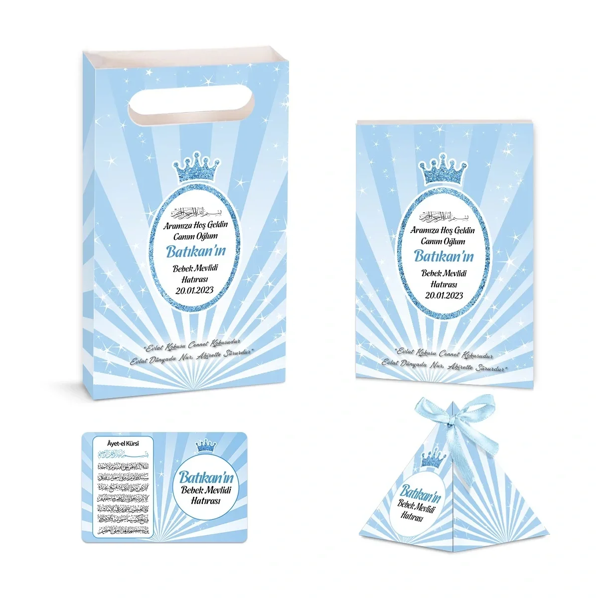 Taç Model Mavi Renkli Yasin Kitabı, Piramit Külah, Ayet-el Kürsi Magnet, Karton Çanta - Mevlüt Hediyelikleri