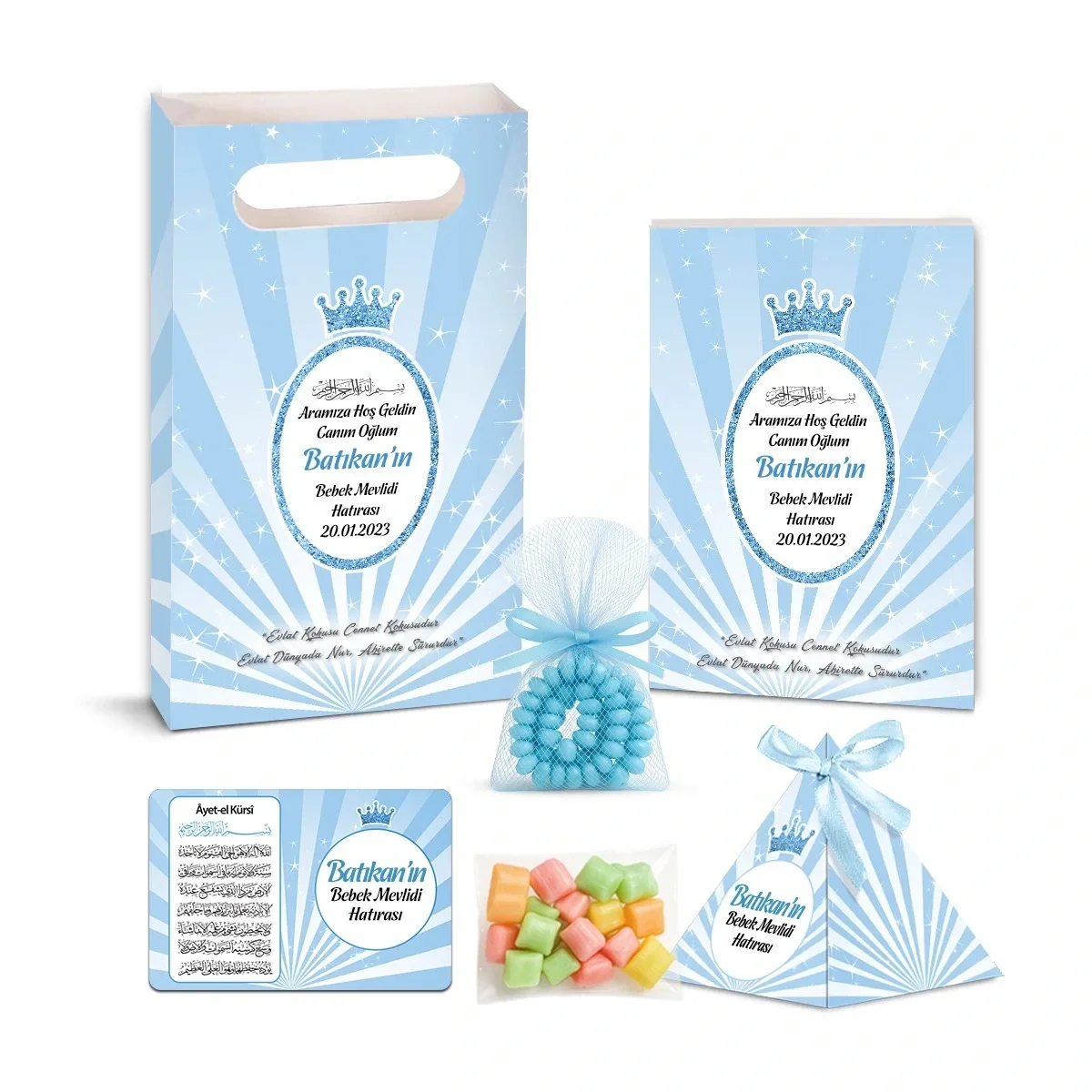 Taç Model Mavi Renkli Yasin Kitabı, Piramit Külahı, Mevlüt Şekeri, Ayet-el Kürsi Magneti Karton Çanta ve Tesbih ile mevlütlerinizde en şık ve kaliteli mevlüt hediyelikleri dağıtın. Aynı gün kargo imkanı, kapıda ödeme seçeneği, ücretsiz iade ve değişim kolaylığı.