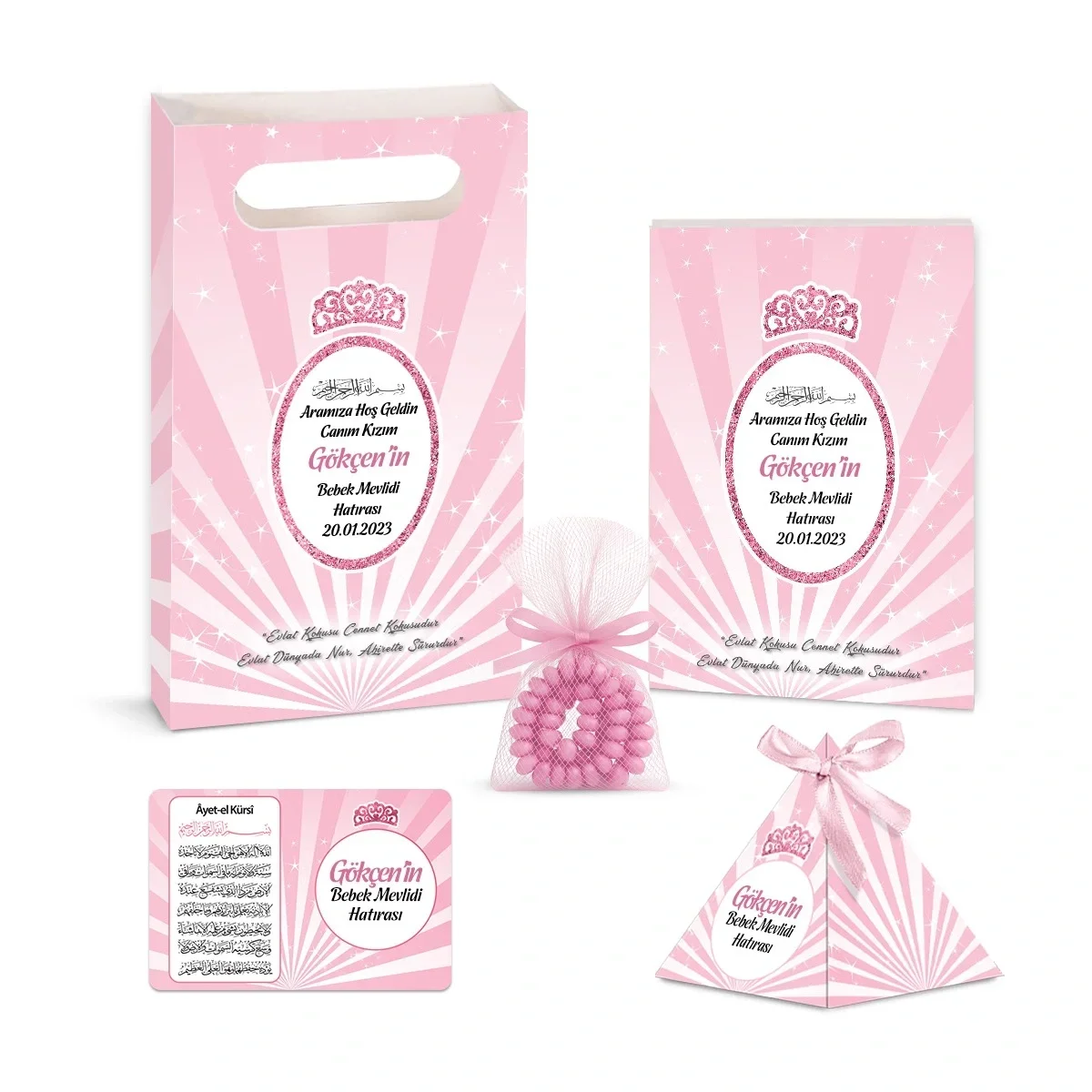 Taç Model Pembe Renkli Yasin Kitabı, Piramit Külah, Ayet-el Kürsi Magnet, Karton Çanta ve Tesbih - Mevlüt Hediyelikleri