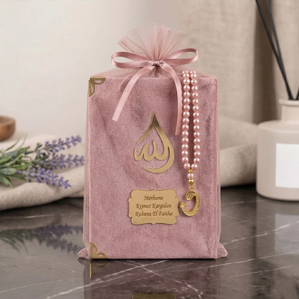 Tül Kese İçerisinde İnci Tesbihli Pembe Renkli BabyFace Yasin Kitabı Seti - Mevlüt Hediyelikleri