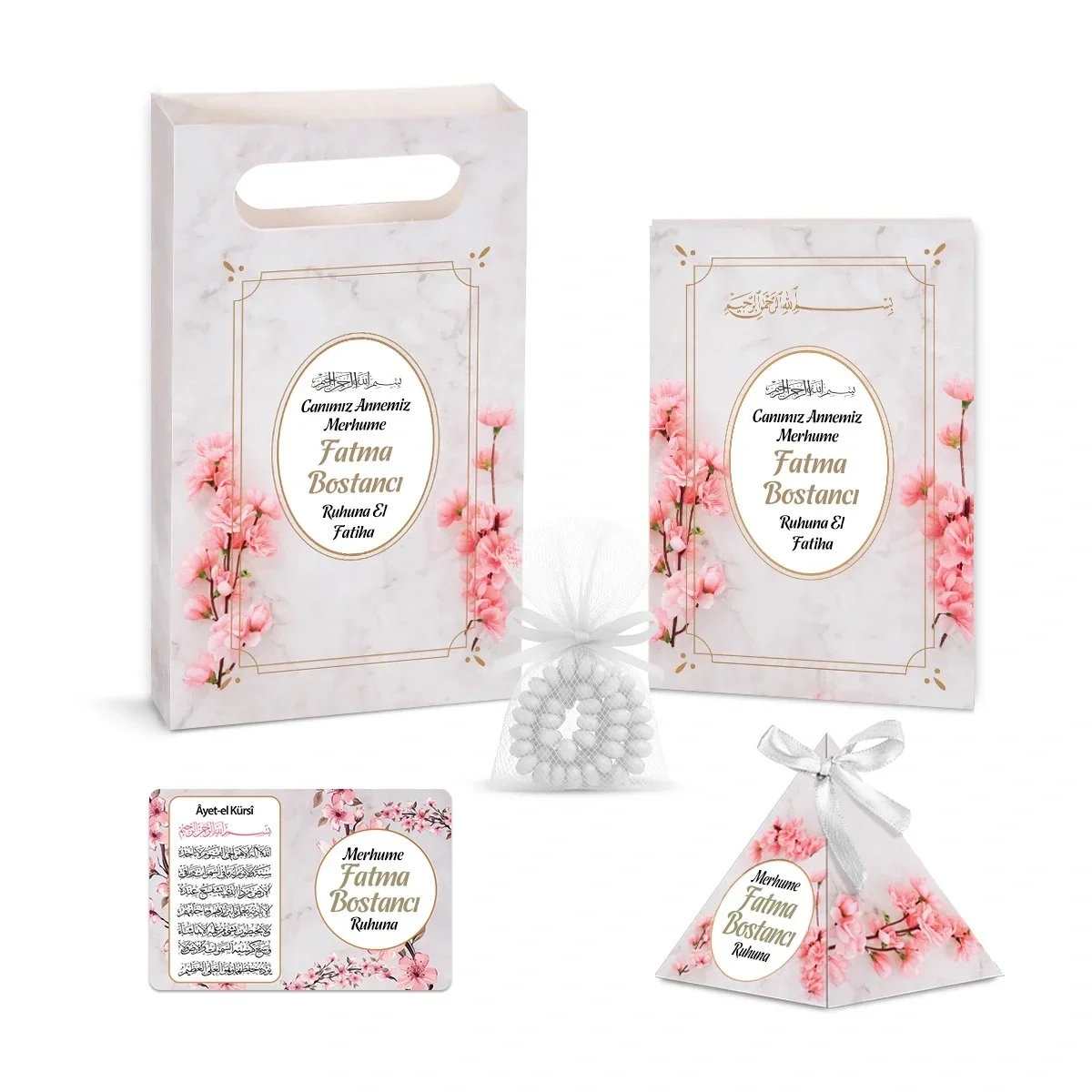 Zerafet Model Pembe Renkli Yasin Kitabı, Piramit Külah, Ayet-el Kürsi Magnet, Karton Çanta ve Tesbih - Mevlüt Hediyelikleri